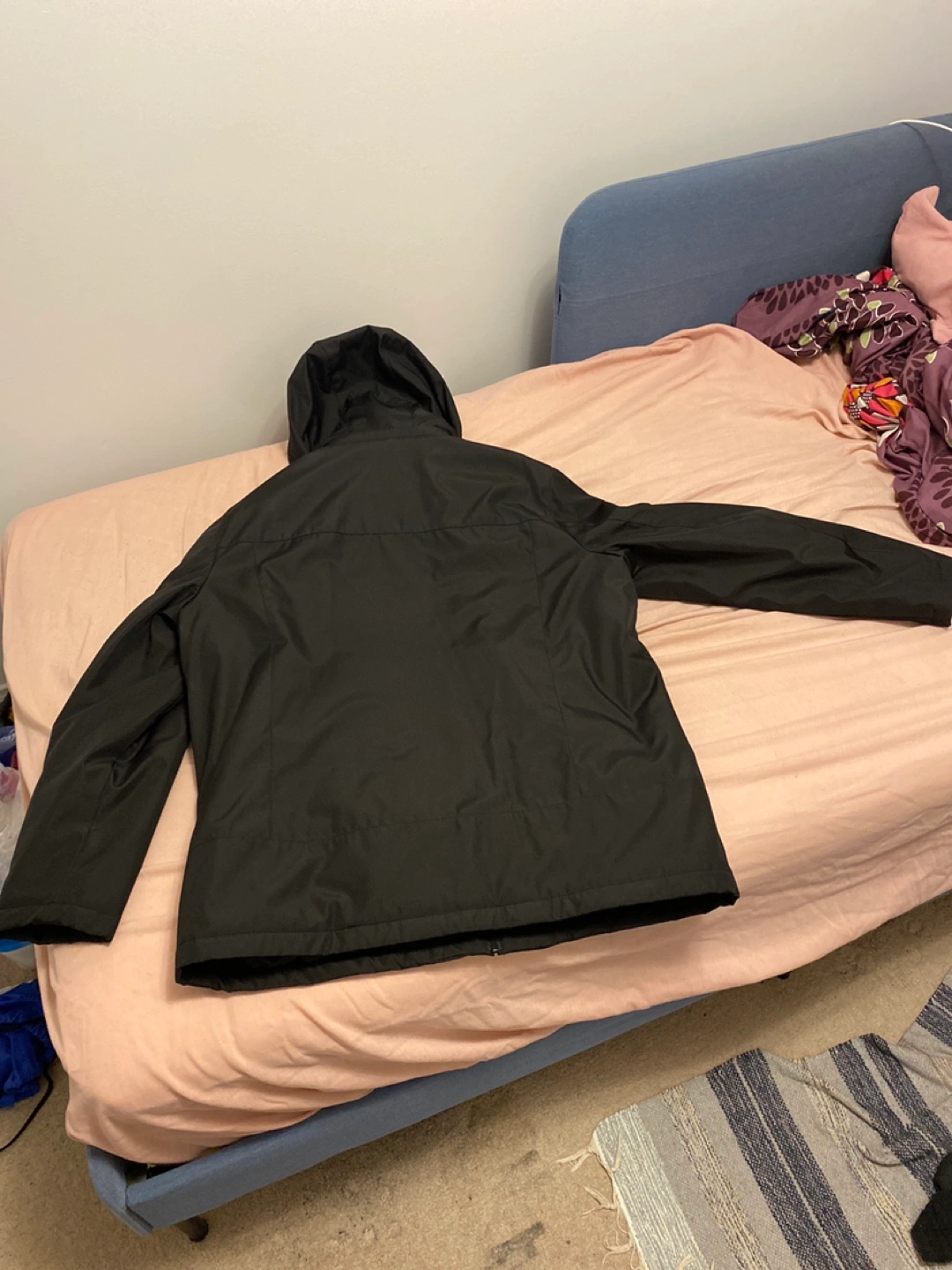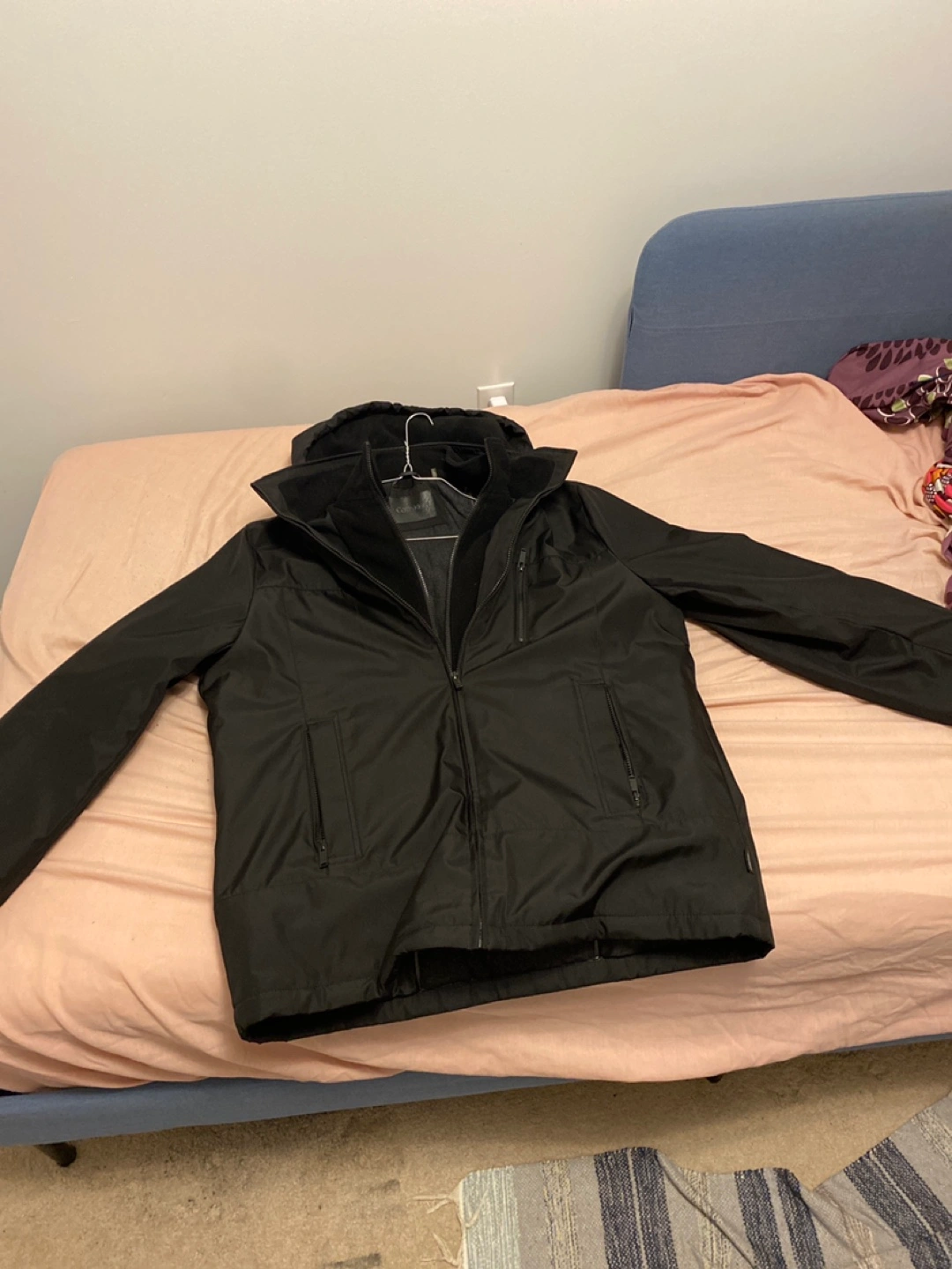 Black winter jacket with a hood. Has multiple pockets with 2 Layers.