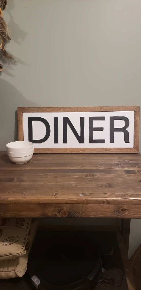 Wooden sign with the word Diner. Black letters on white background. Measures 16 inches wide by 6 inches tall.