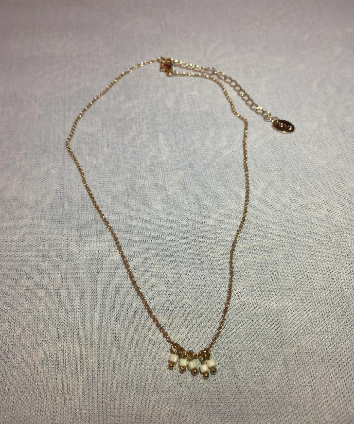 1000+Gold chain necklace with small white beads. Lobster clasp closure.