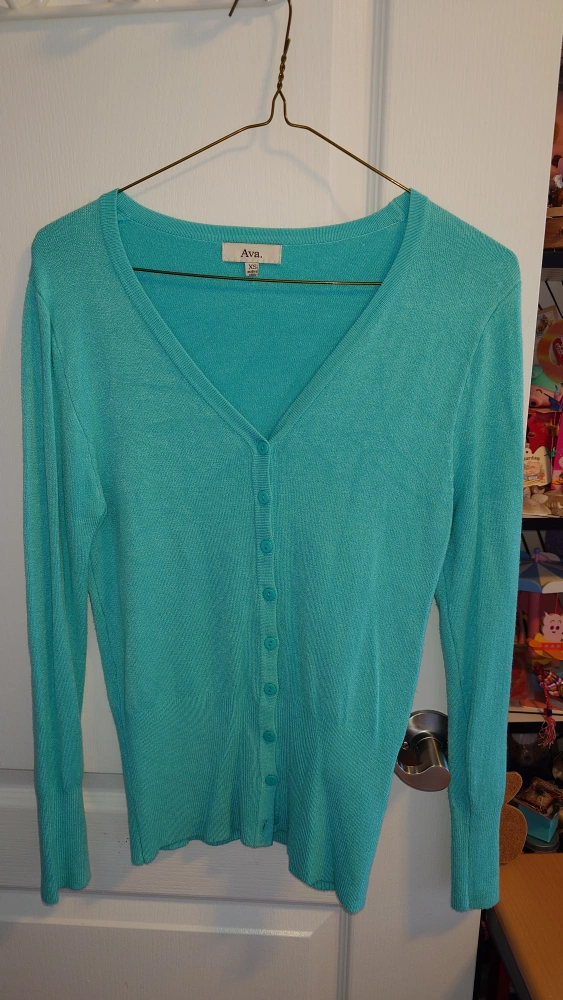 Turquoise long-sleeved cardigan sweater with button closure. Size XS.