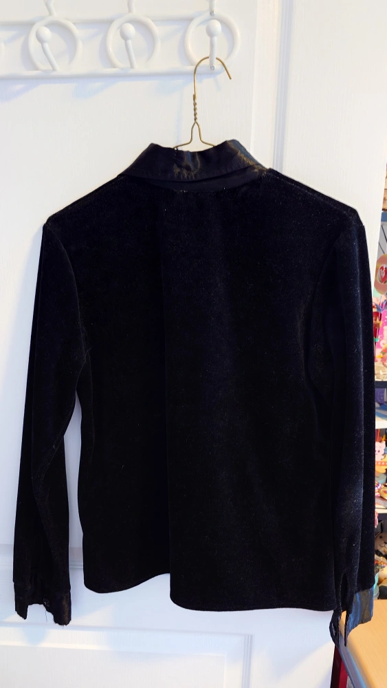 Black velvet shirt with satin collar, cuffs and down the middle. Size M.