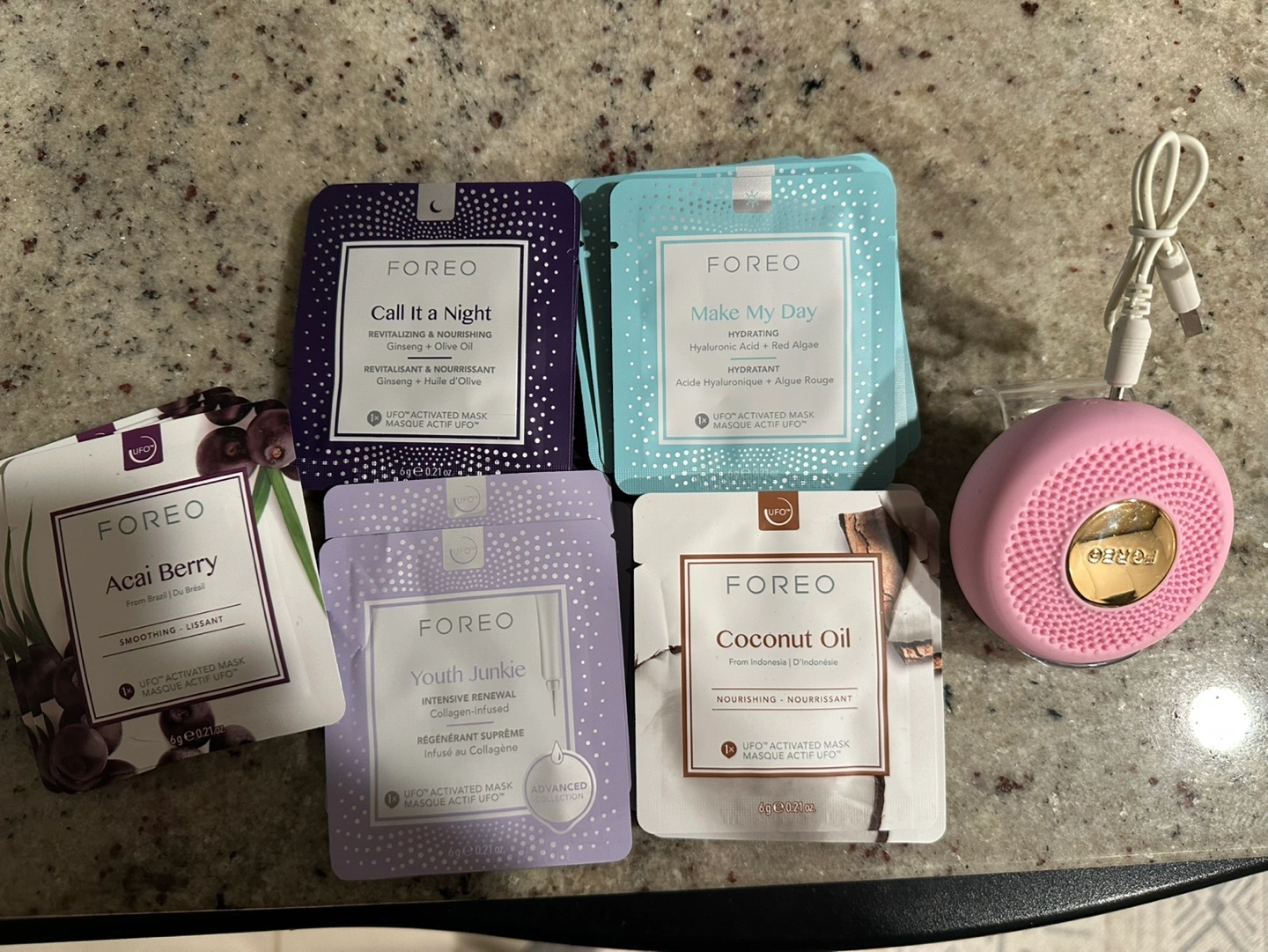 FOREO UFO 3 mini - 4-in-1 Full Facial LED Mask Treatment. Includes the device and several mask sachets, comes with a charger, no box. The device was used may be three times, like new. Masks are expired as of October but according do internet still can be used. Pick up downtown only.