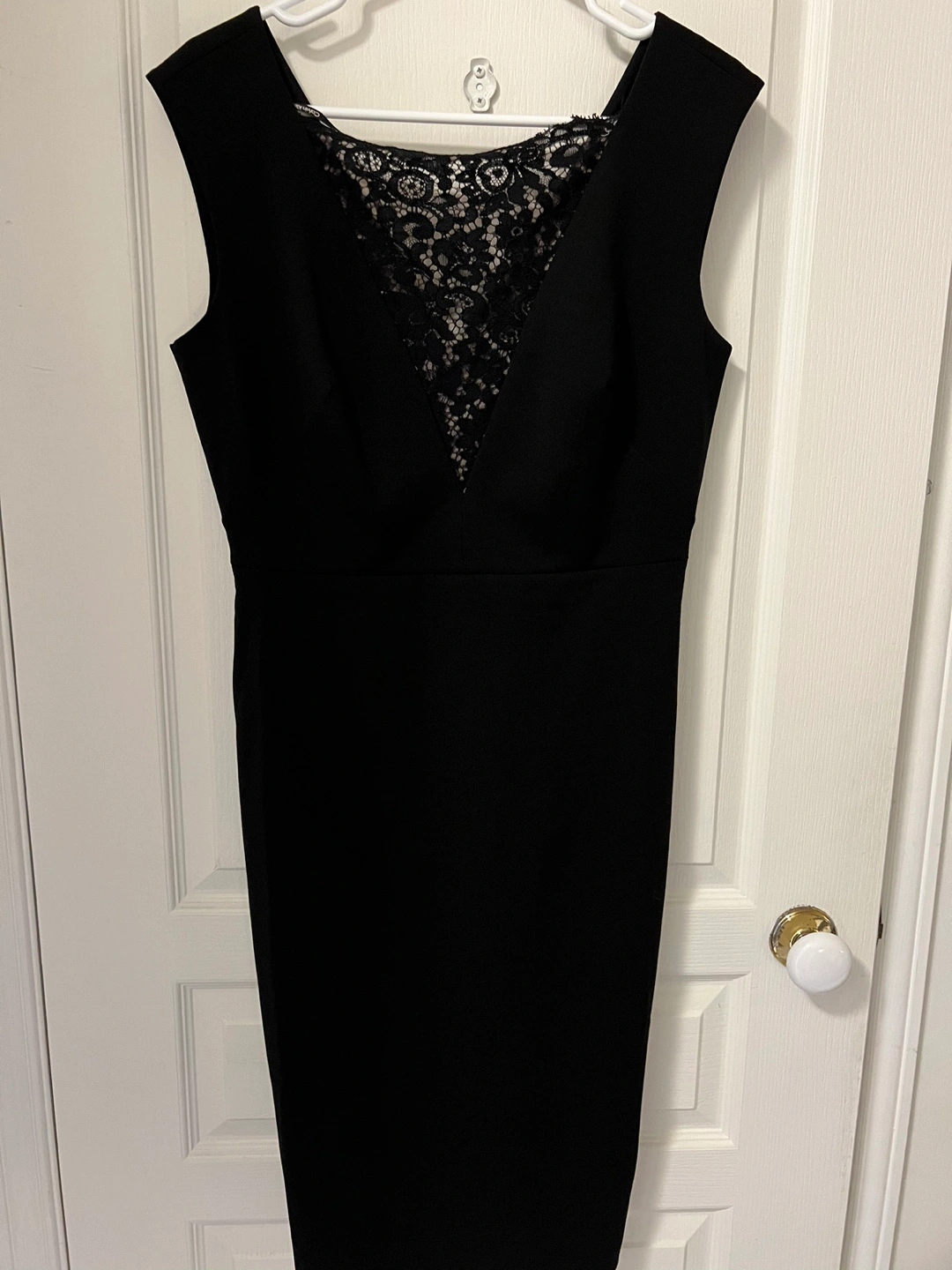 Sleeveless black dress with lace overlay. The dress is fitted with a v-neck and a back zipper.