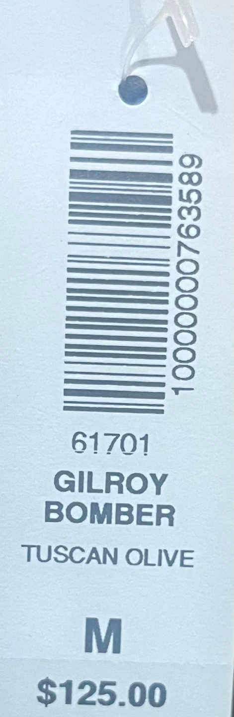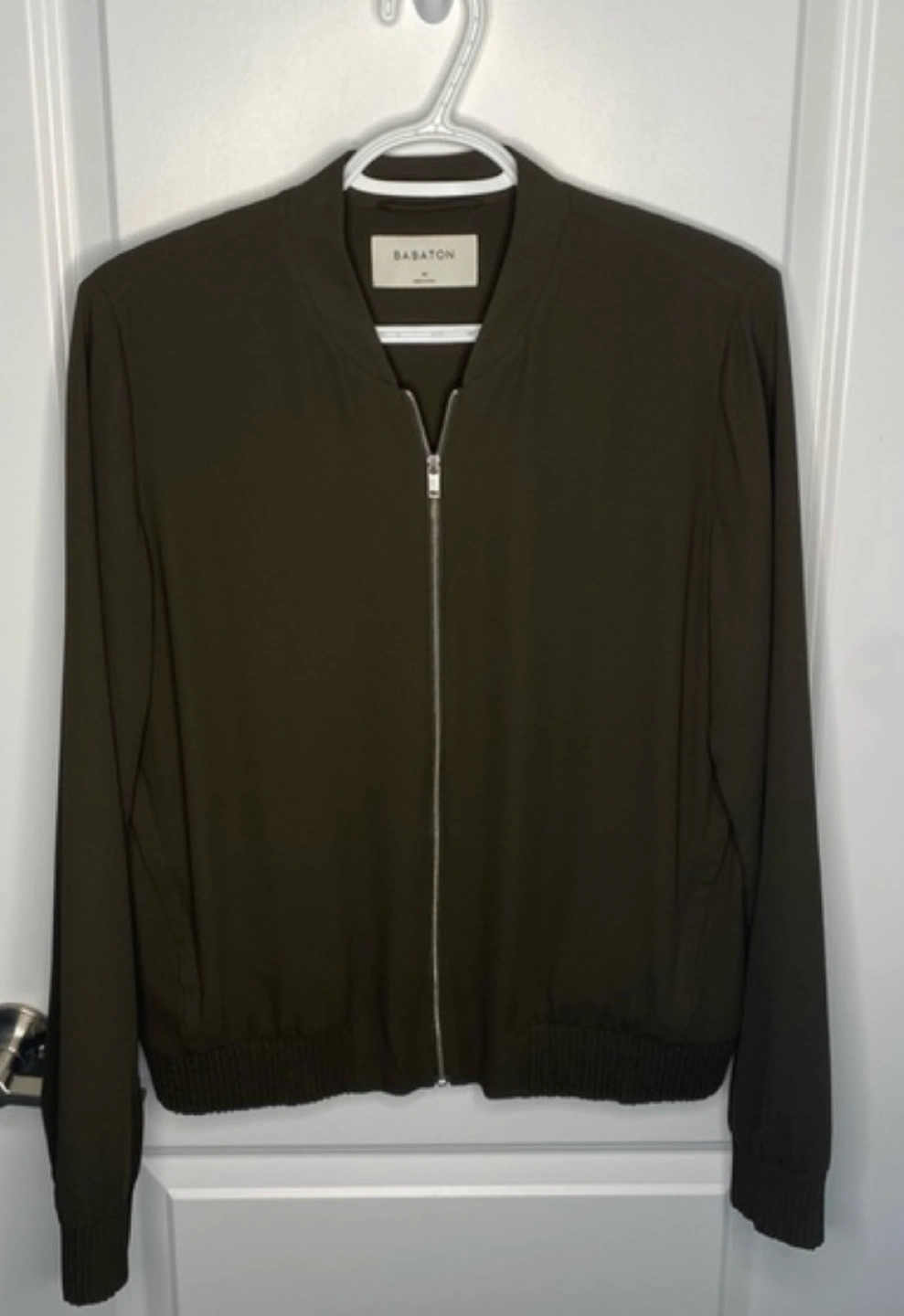 Green bomber jacket with a zipper closure. It has a ribbed hem and cuffs. ARITZIA