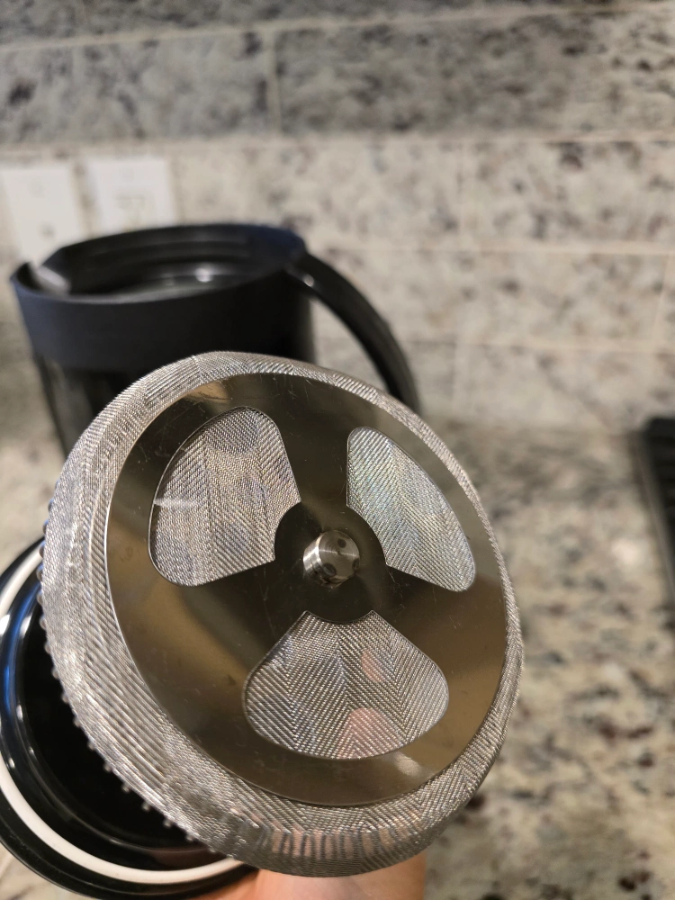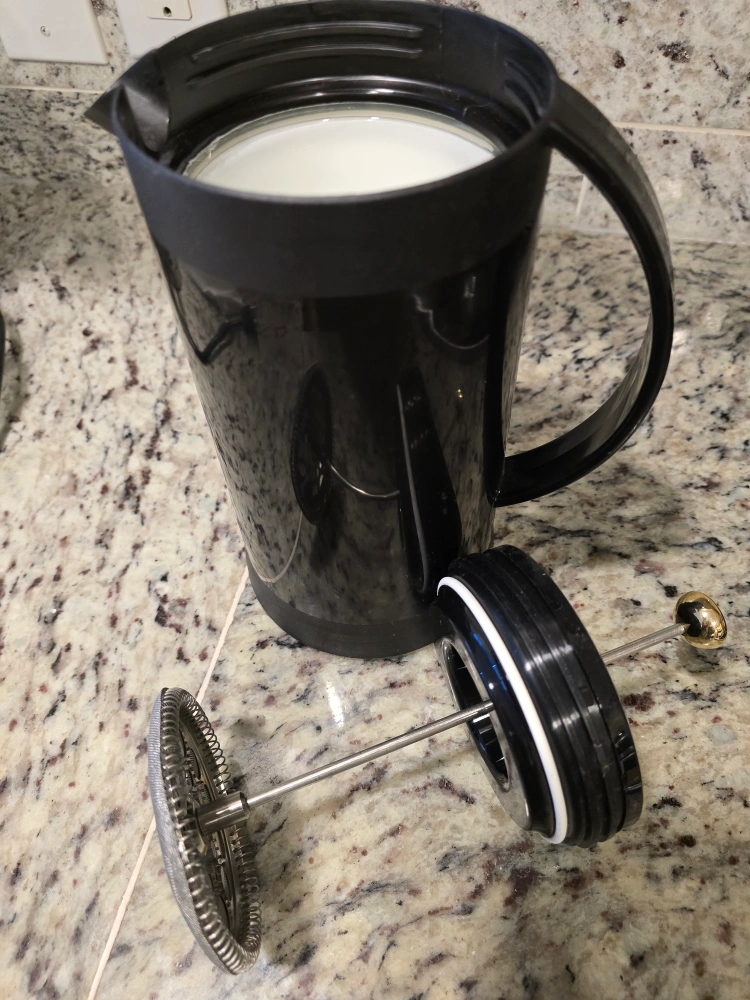 French press coffee maker with a stainless steel filter.