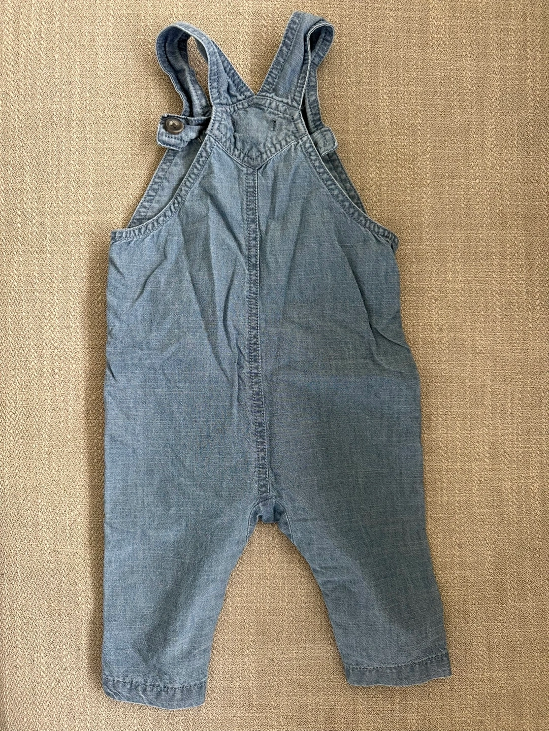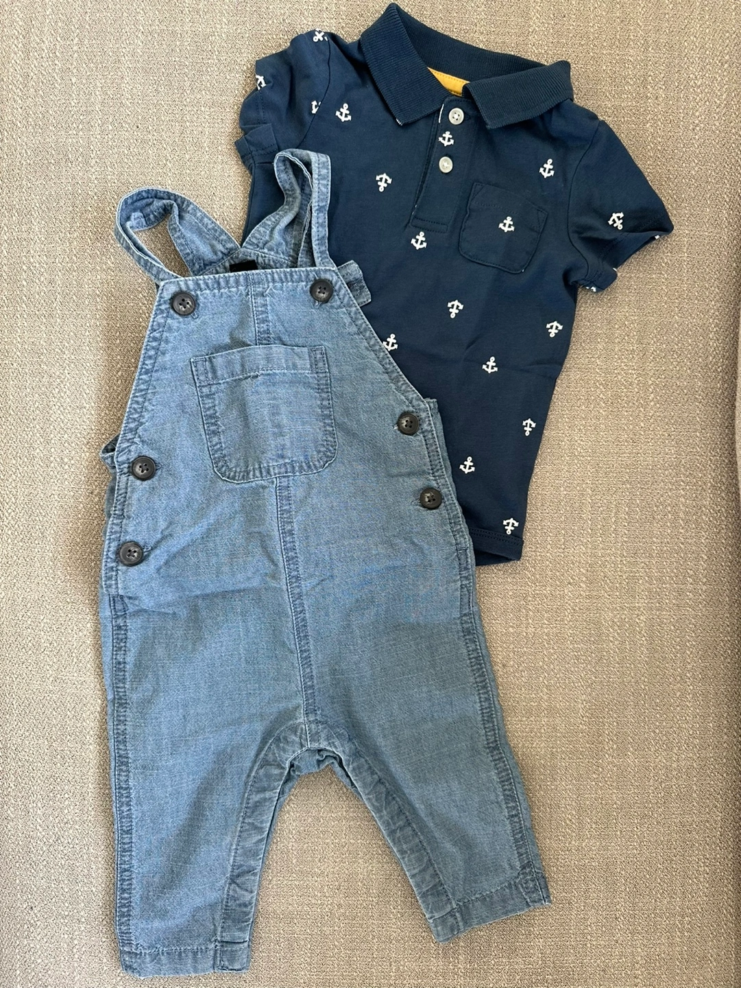Blue denim overalls and a navy blue polo shirt with anchor print.
