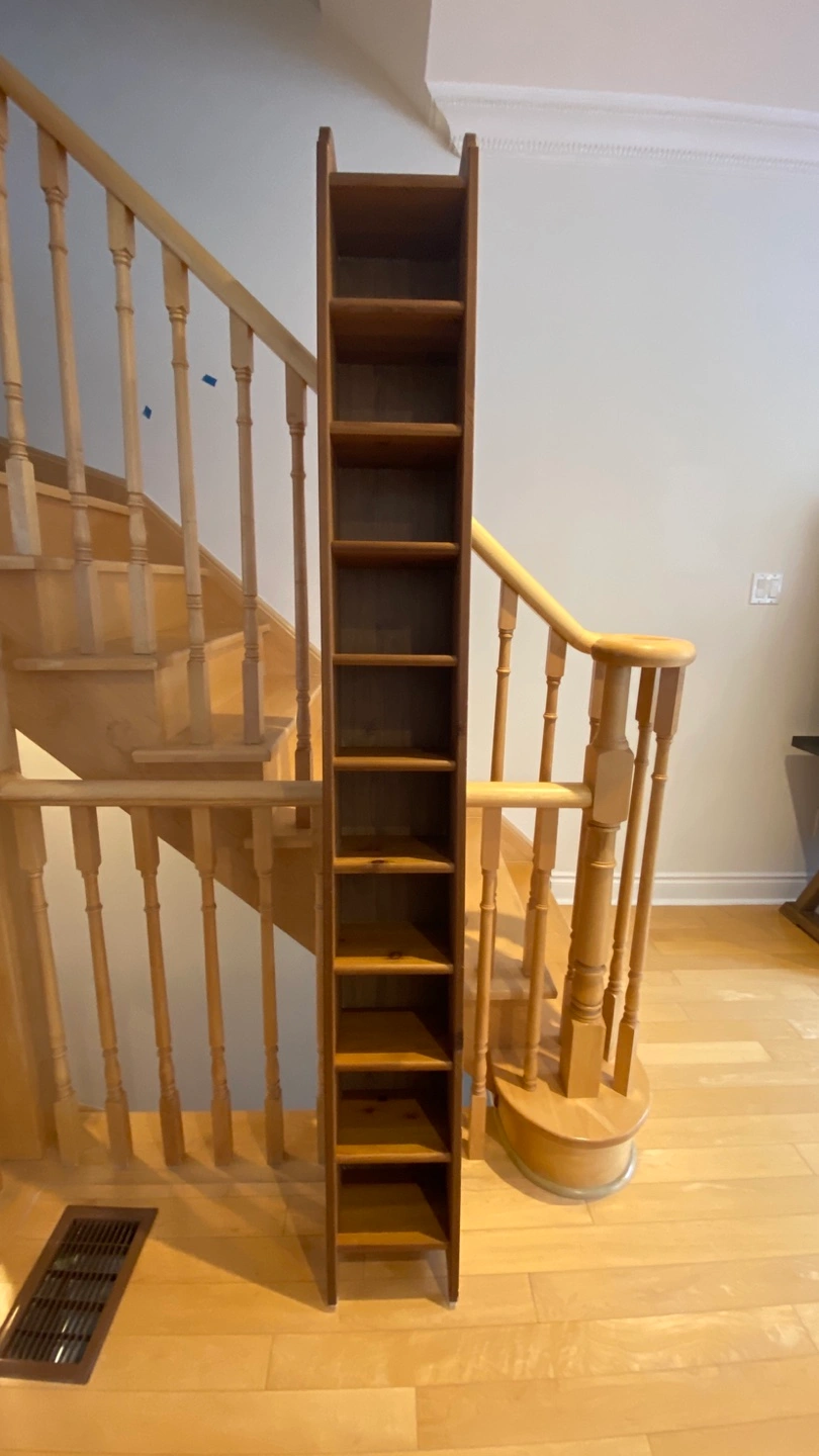 IKEA Tall wooden shelf with 10 shelves. Great for video games, or other items such as infant clothes/toys. Ideal to install at the corner of the room as it is narrow and doesn’t take too much space