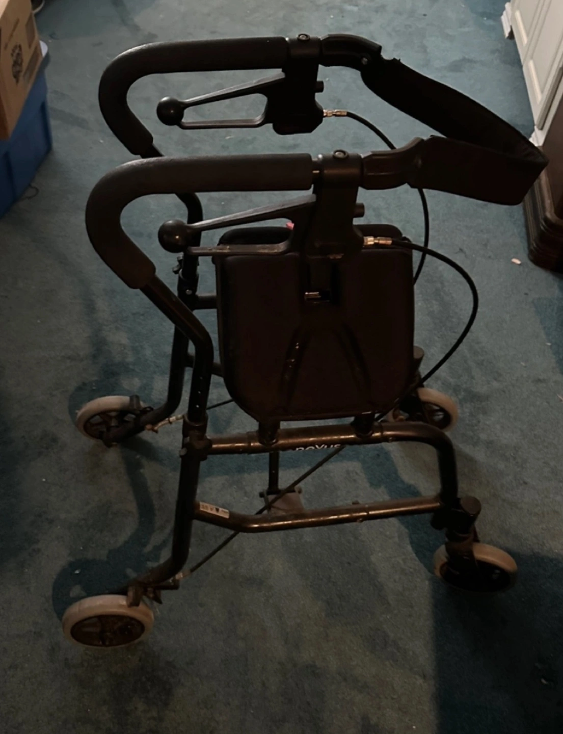 10Black rollator walker with a seat and storage bag. Has adjustable height handles and brakes on all wheels.