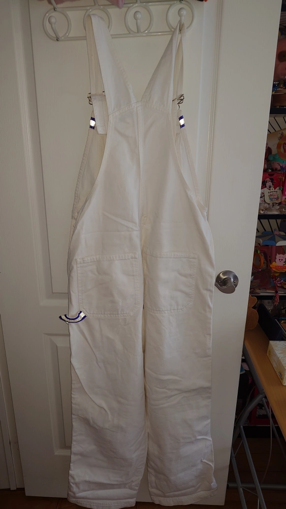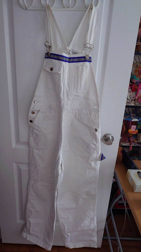 239White denim overalls with blue and silver reflective stripes. Fits more like size M.