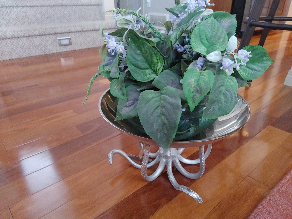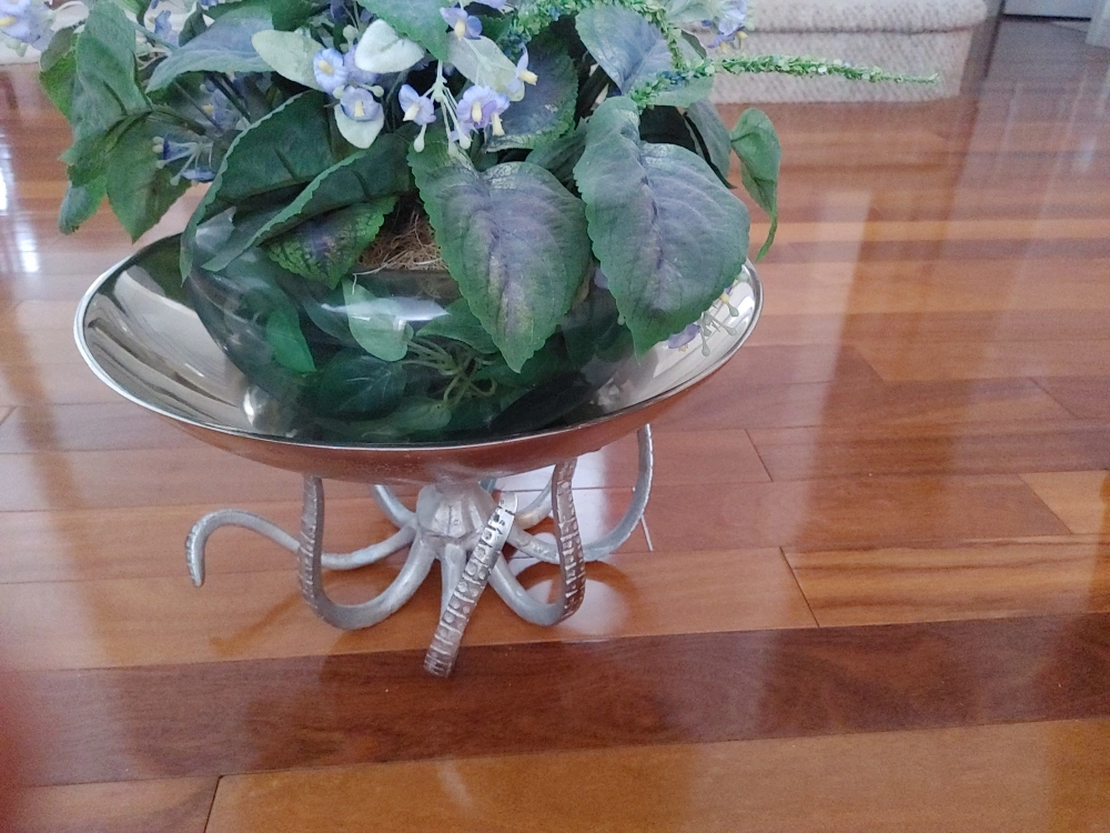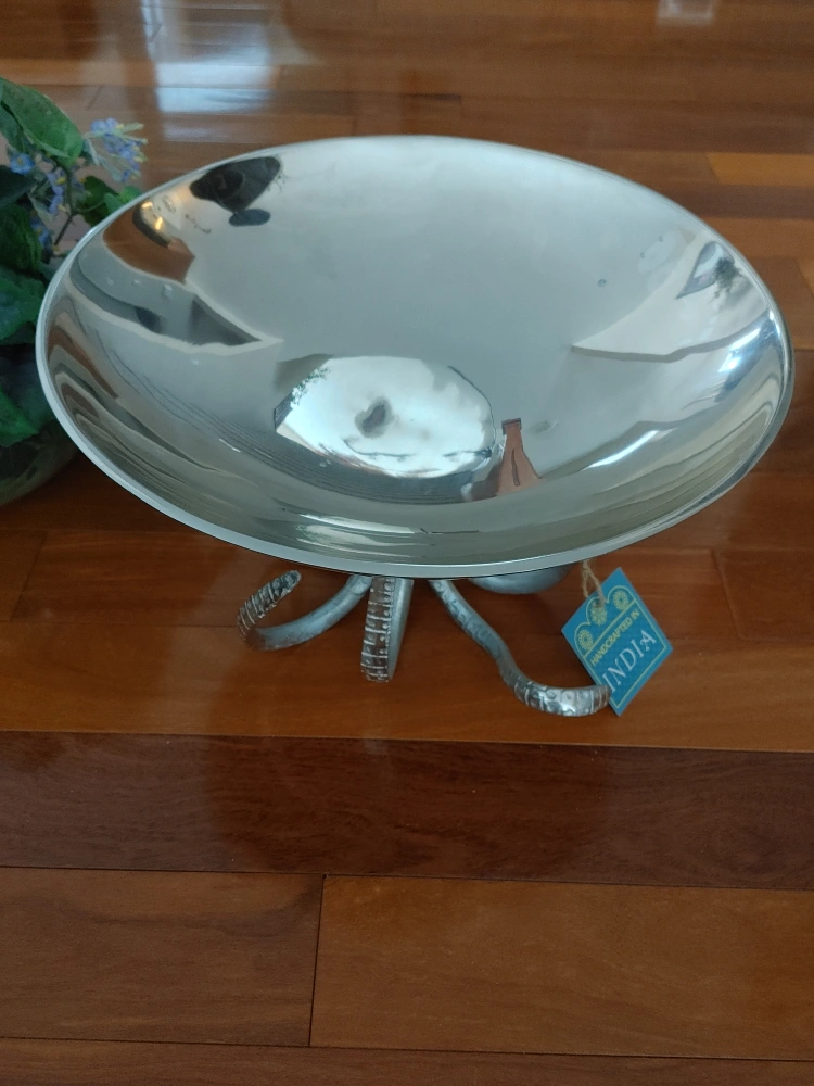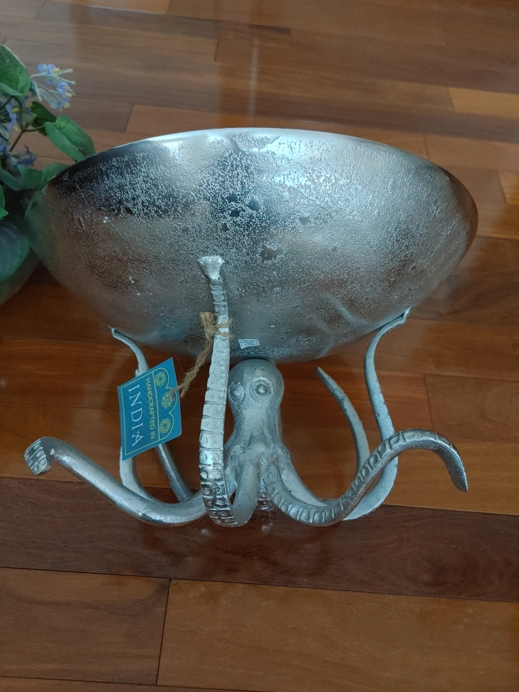 New. Silver bowl with an octopus base. Perfect for holding fruit, flowers, keys, or other small items. Unique gift for any occasion.