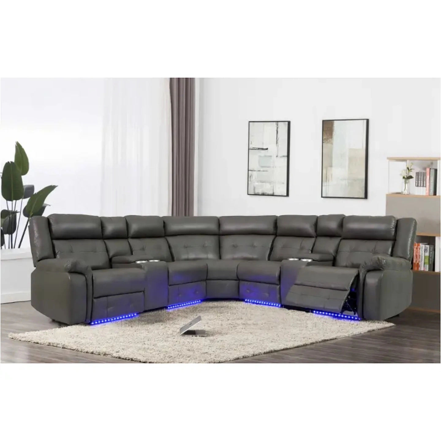 Leather sectional sofa with reclining seats. Features LED lights underneath. Cup holders on each side. Great for entertainment rooms.in stock in two color black and gray in stock we do deliver it to you