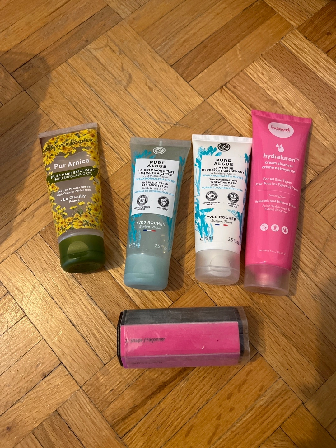 Set includes three Yves Rocher skincare products and a pink foot file. Two of the skincare products are related to algae, the other is a hand exfoliating oil. Used/open products