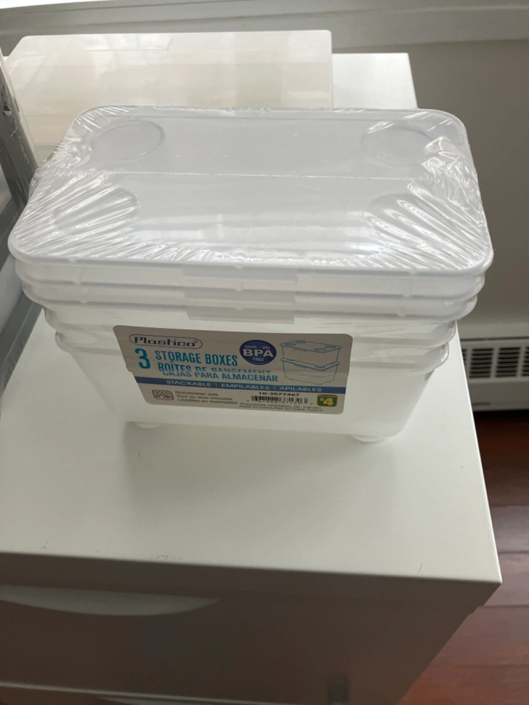 3 storage boxes stackable. Clear plastic