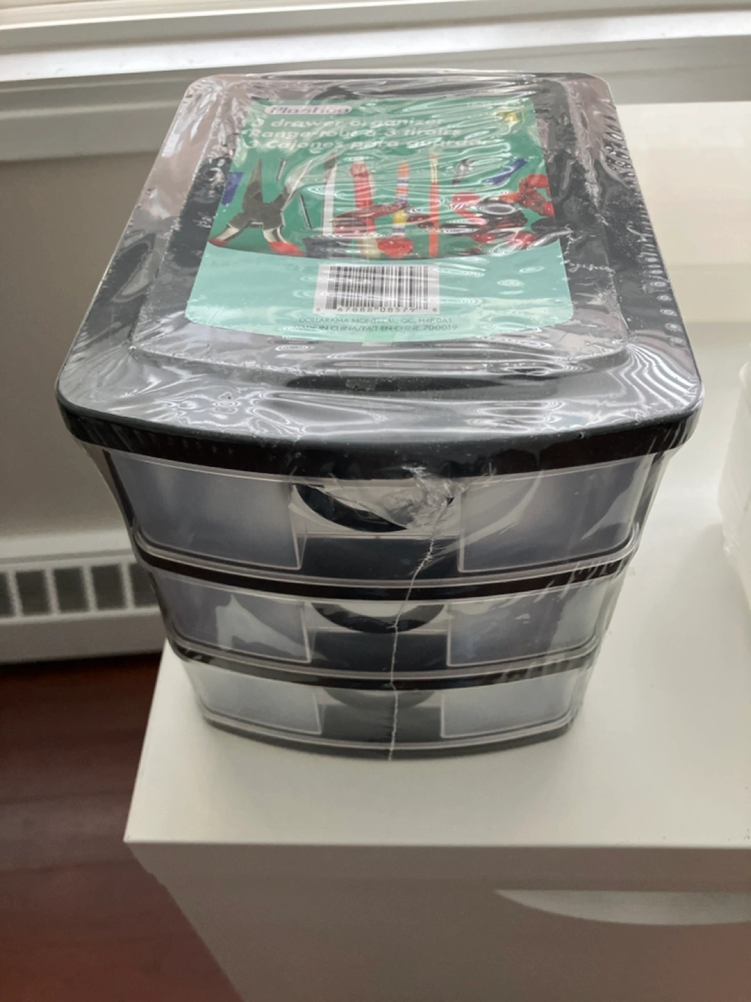 3 drawer storage box. Clear plastic with black trim.