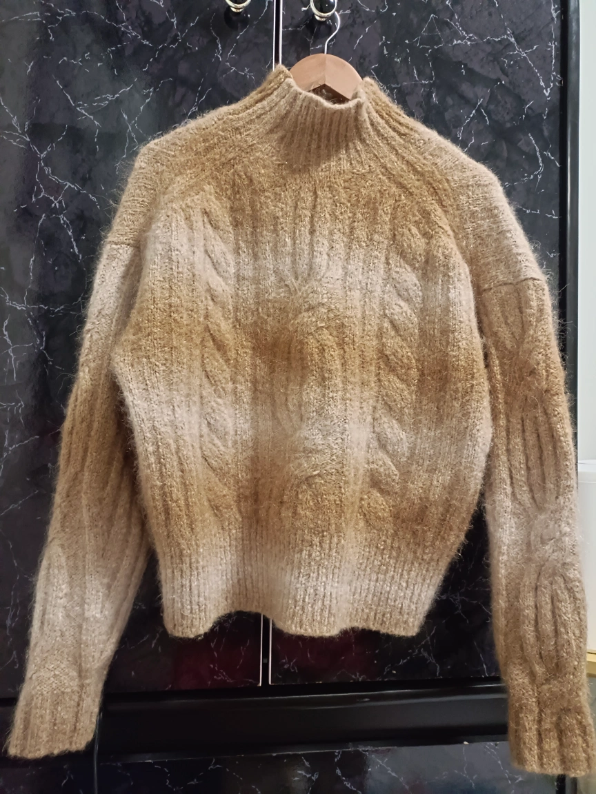 Long-sleeved, brown and white, cable knit sweater with a high neck. Made of Italian yarn and Alpaca.