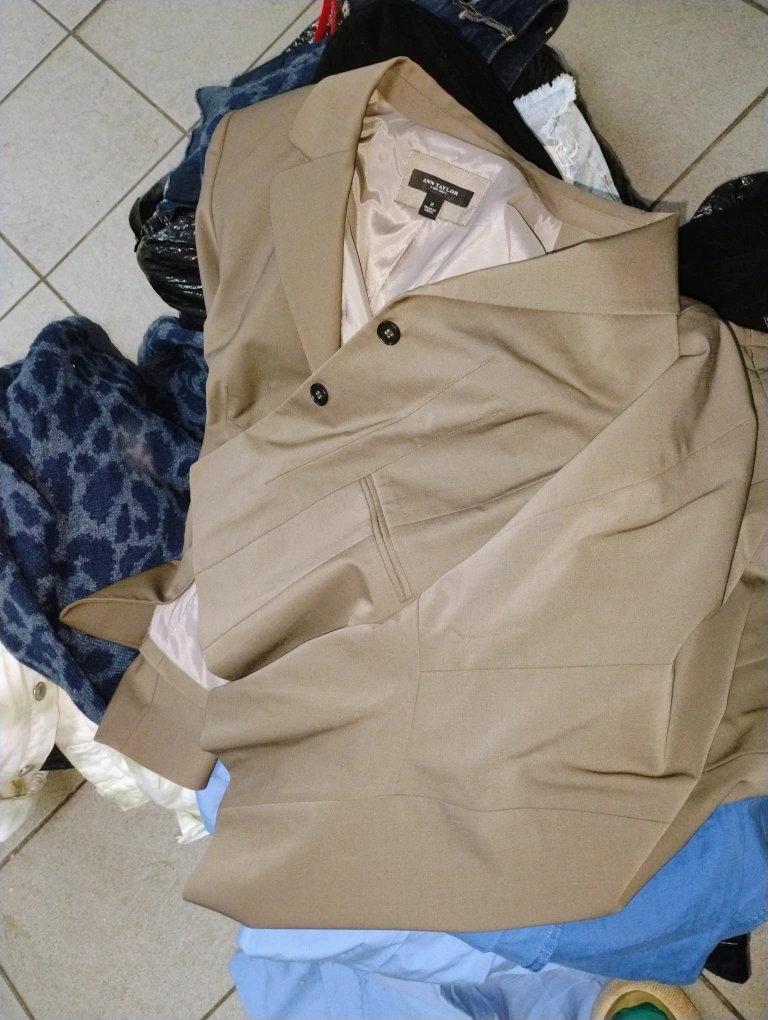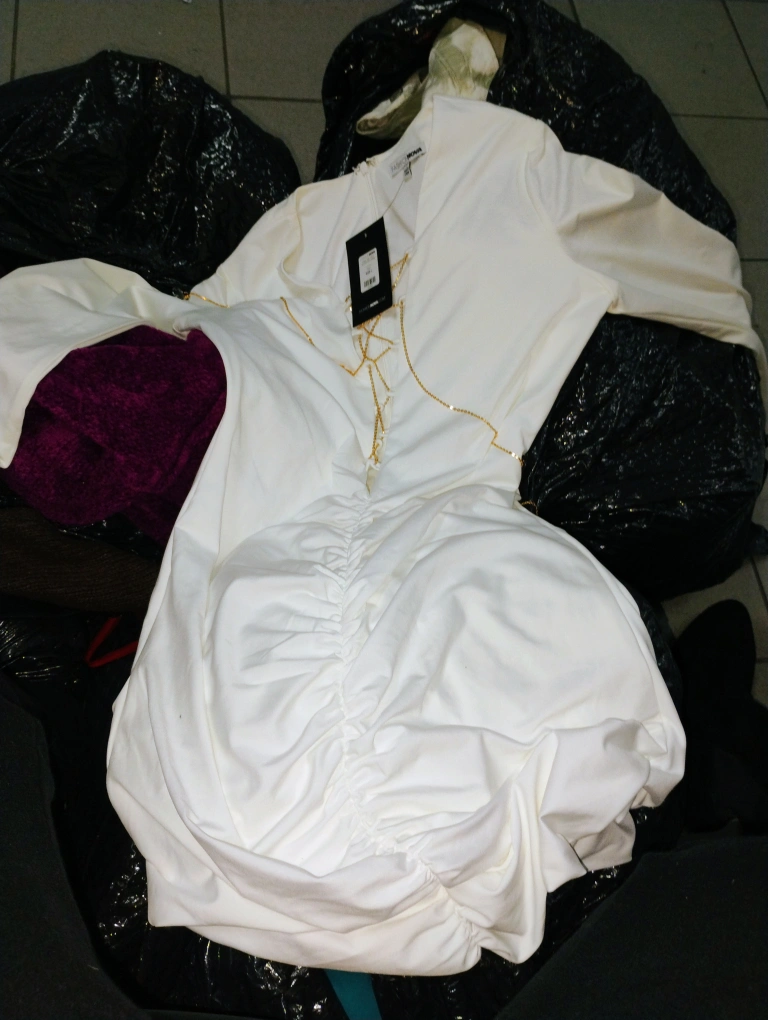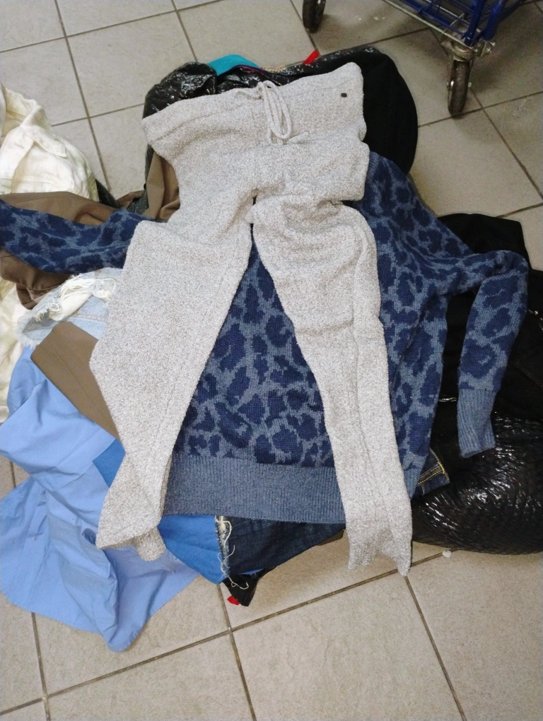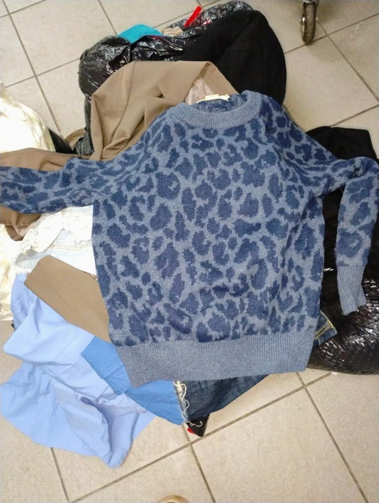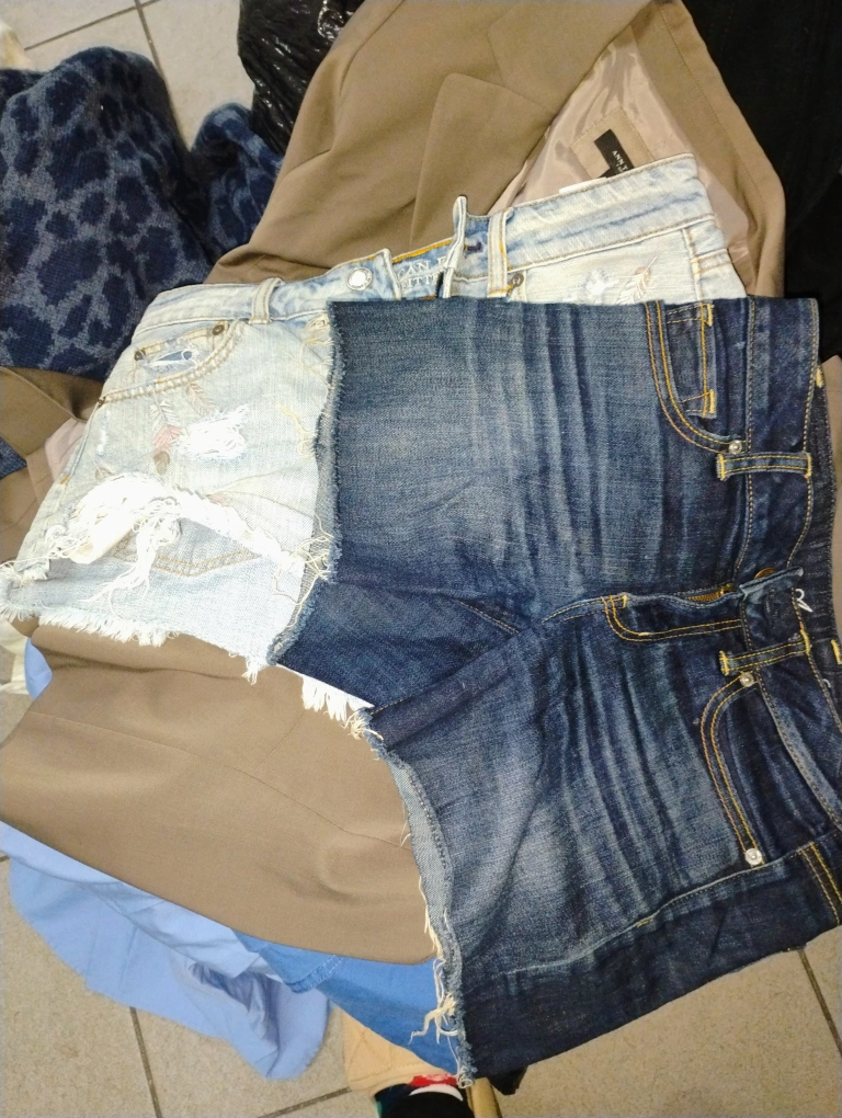 Bundle includes a white dress with gold chain detail, a blue leopard print sweater, two pairs of denim shorts, and a black and white striped shirt. All items are in excellent or new condition. you can come take a look I'll be posting some stuff separately it's just a lot to go through and I also have a lot of scarves everything is new or the tags are ripped off oh my God