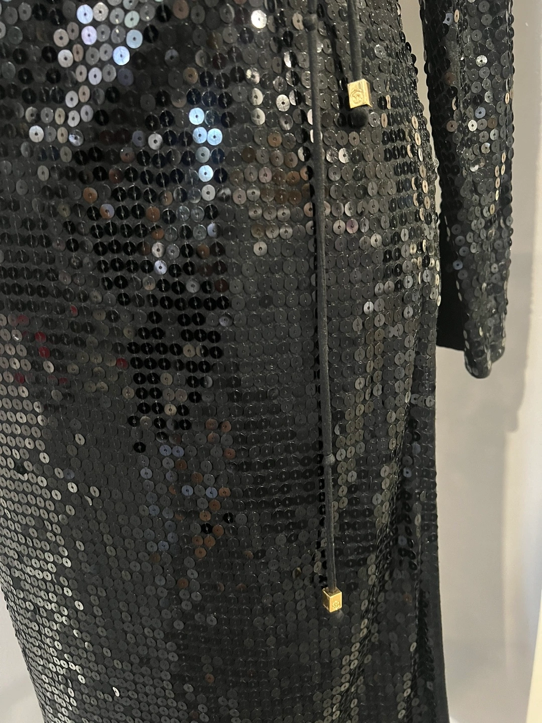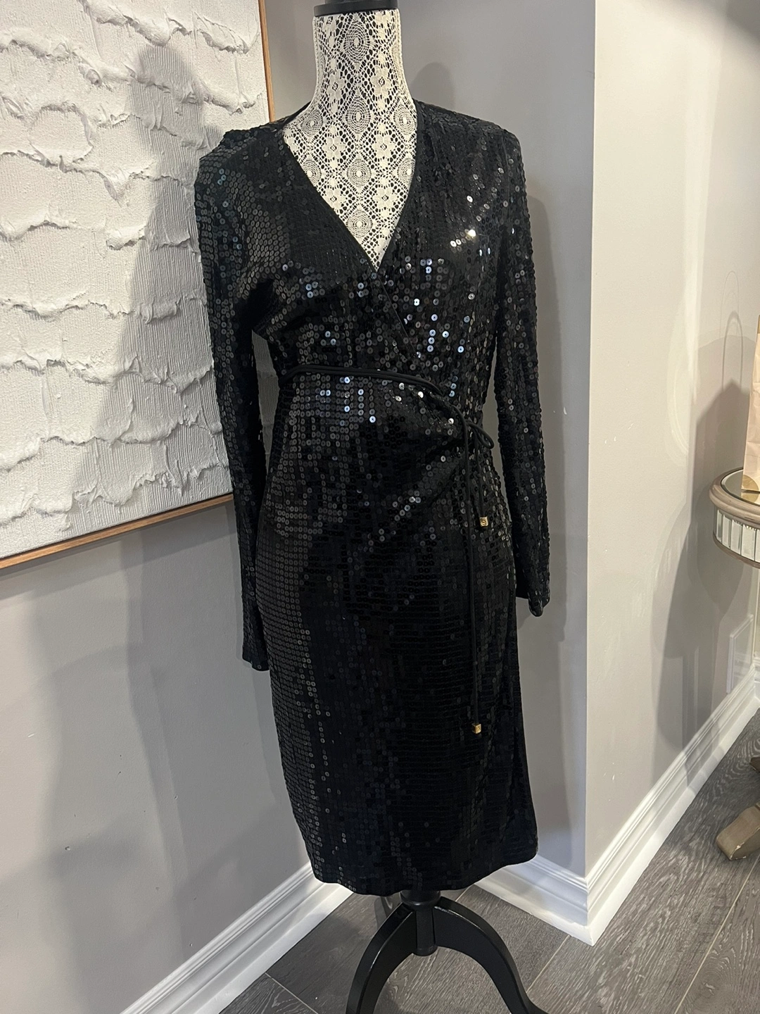 120Long-sleeved wrap dress with a V-neck and a tie at the waist with gold details. Covered in black sequins. It’s a generous small & can be used as a medium. Stunning piece for the upcoming holiday season. DM to reserve before it’s gone!