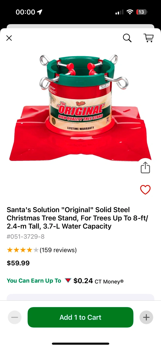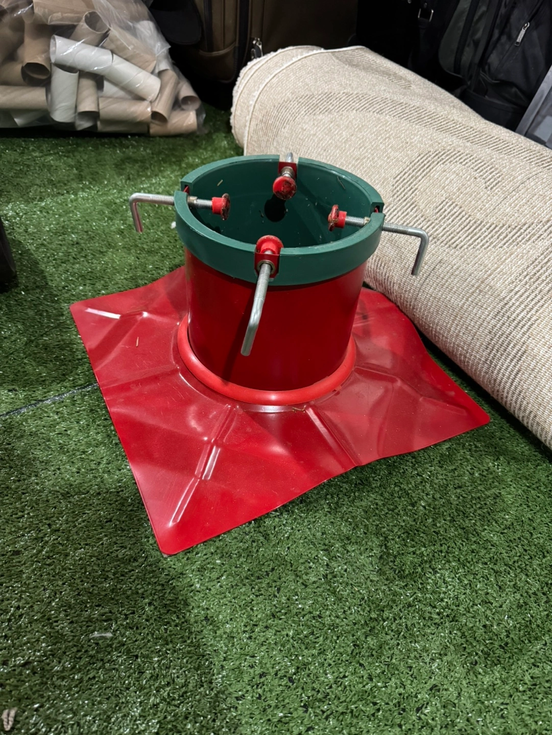 Solid steel Christmas tree stand, for trees up to 8 ft tall. 3.7 L water capacity.
