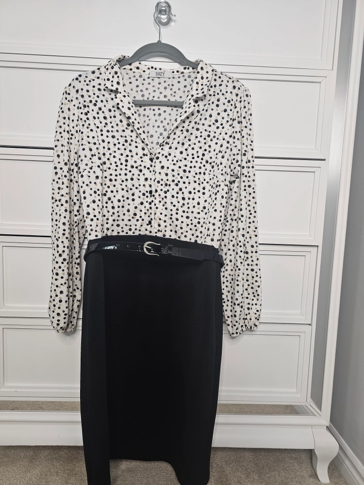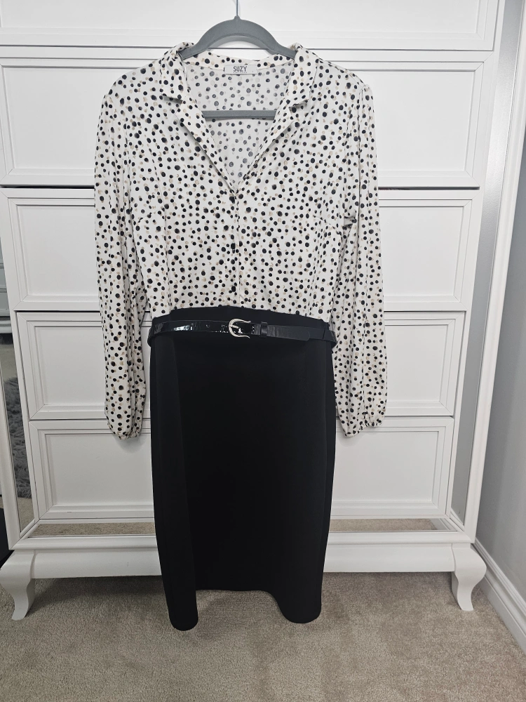 Long-sleeved white and black polka dot blouse with button closure. Black skirt with matching black belt.