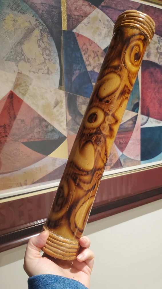 This is a real instrument! A Rainstick bought in Africa. The sound trickles like actual rain. Wooden rain stick with a burnt finish. 15.5 inches long and 3 inches in diameter.