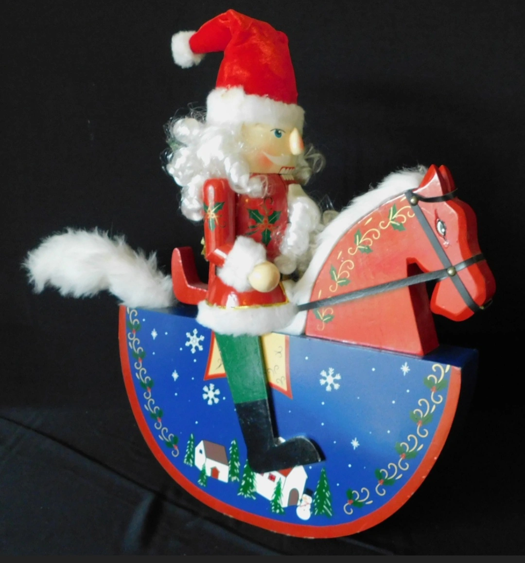 Santa Claus nutcracker riding a rocking horse. Wooden with fabric accents. Has a bag of toys, a white beard, and a red hat. Pick up at Yonge & Steeles