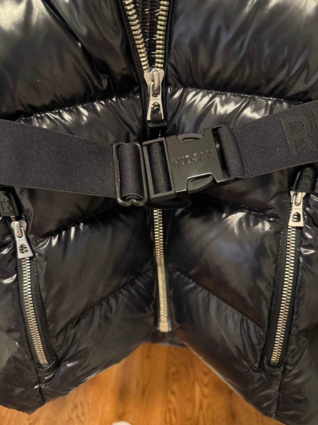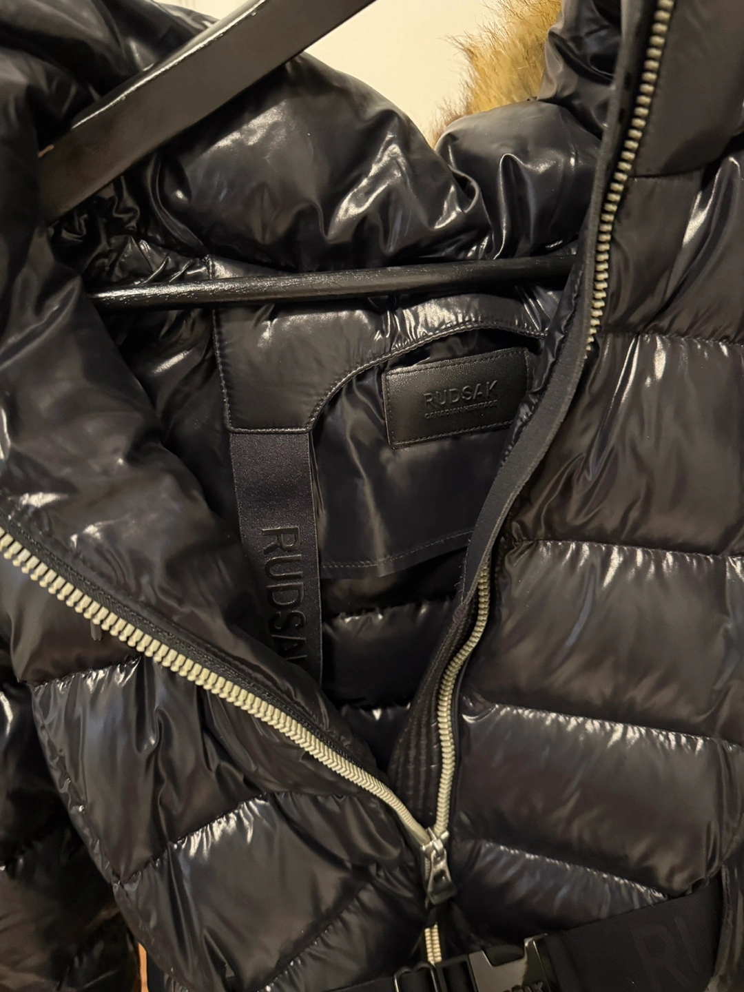 Black puffer jacket with faux fur hood and a belt. Down filled and has two zippered pockets on the front. Size Small.
