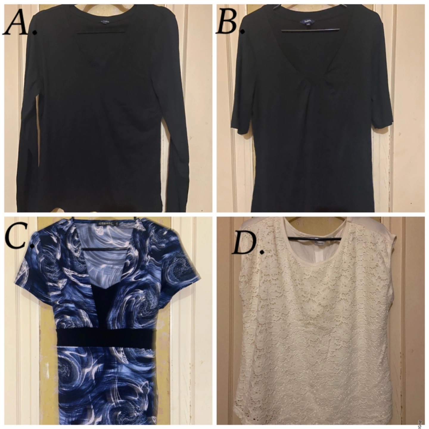 Women’s top size Large Brands- Reitmans and George Condition- worn. In very good shape and condition. Has No rips, No stains, No wear or tear Size- Women Large Description A. 100% cotton, colour black, long sleeves B. 100% cotton, colour black, short sleeves C. 92% polyester/ 8% spandex, colour blue, short sleeves D. 95% viscous/ 5% elastane/spandex, colour white Cash Payment No Refunds / Exchange No try ons, No trading No holds. All purchases are Finally Sale From a Smoke Free home First come, First Serve Fast pick up Price-$5 for each Pick up- In East York Coxwell ave subway station