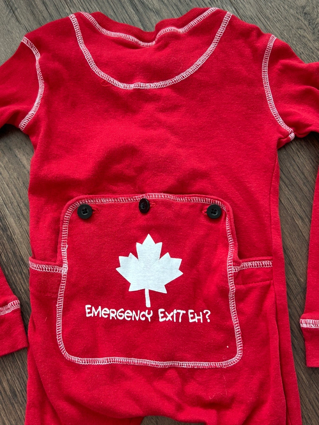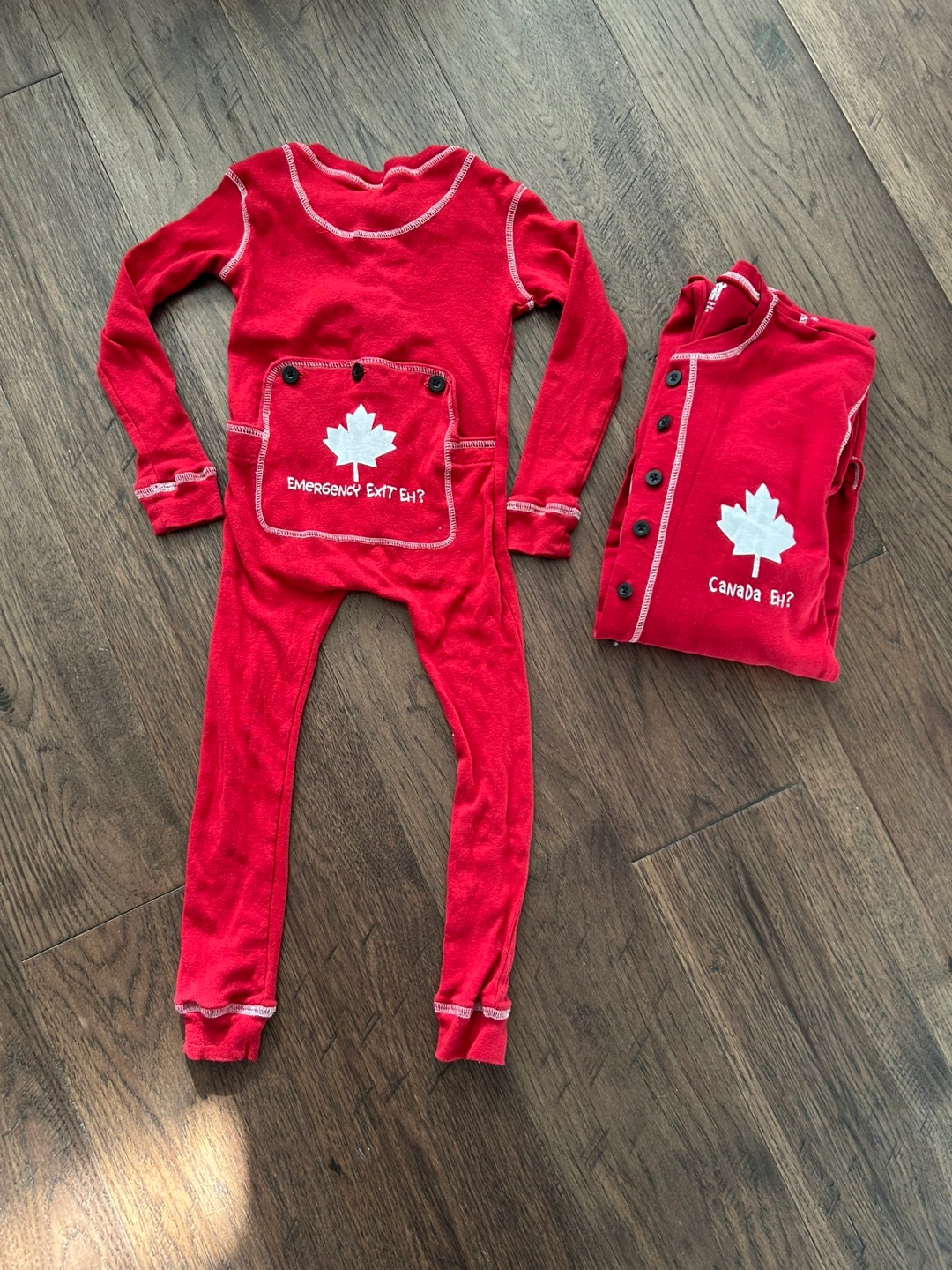 Only worn once for holiday photos. Super cute with a “Emergency Exit Eh?” butt flap. My little one thought it was the funniest thing in the world. Bought for $50+ each.
