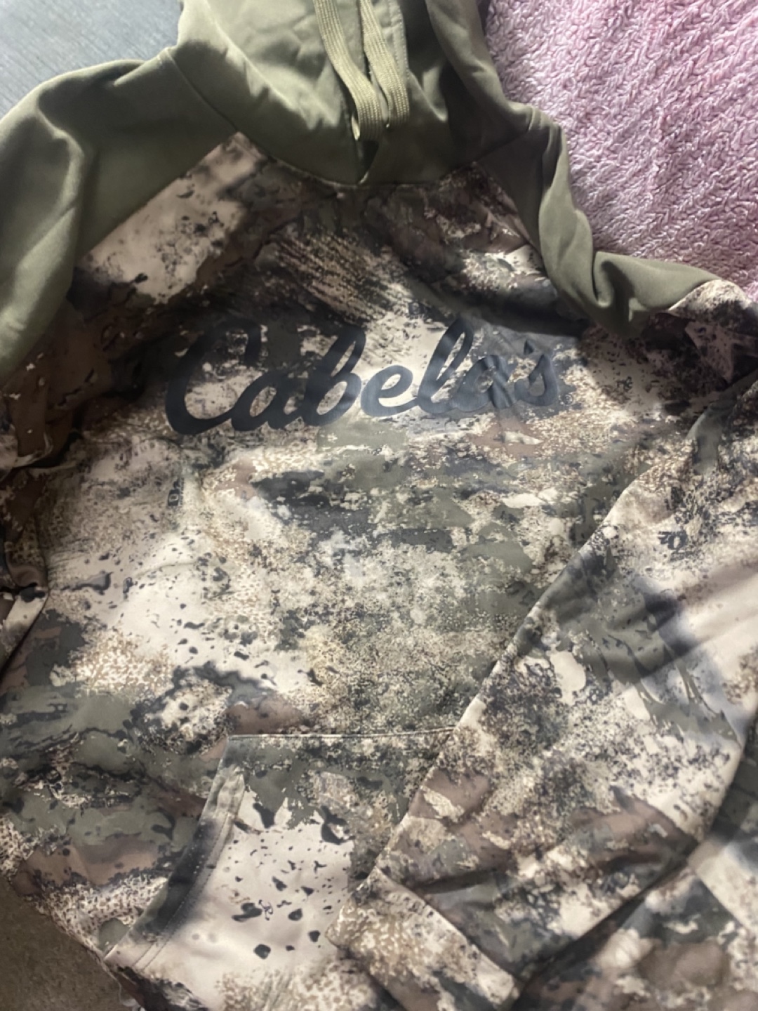 Cabelas hoodie in camo print. Size 3XL. Long sleeves with a hood. Excellent condition. I have 2 exact same including size. Will bundle for cheaper.