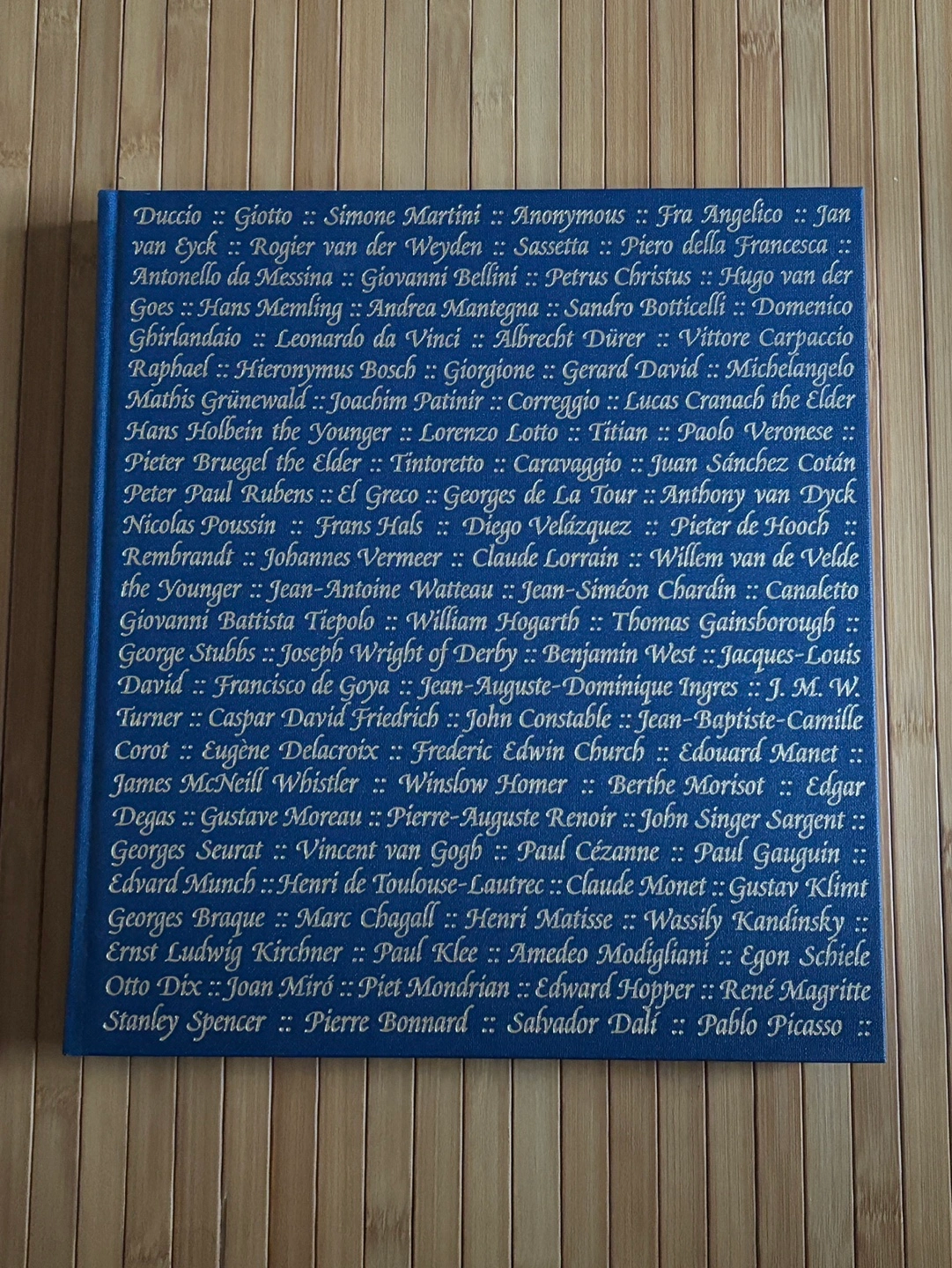 255Hardback book, blue cover with gold lettering. Features famous paintings and information about each artist.