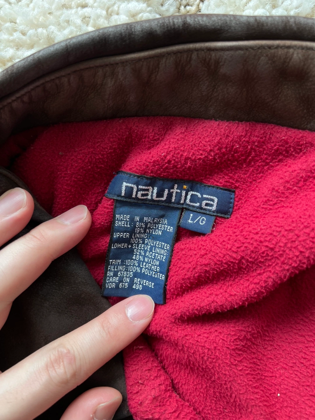 Brown jacket with a fleece interior and a leather collar.