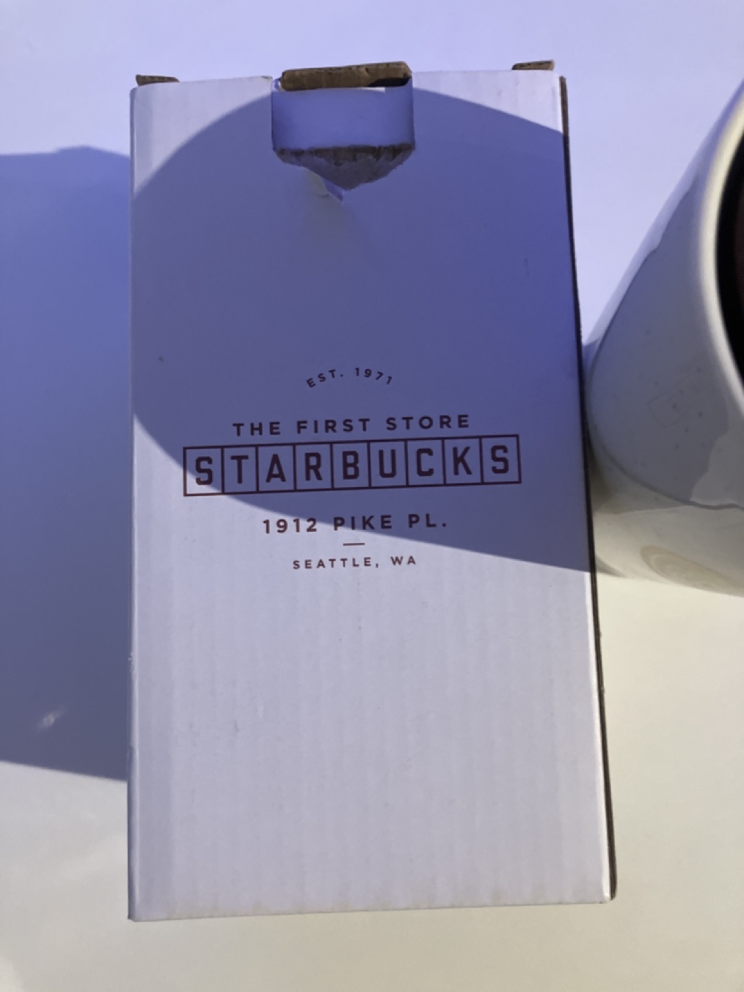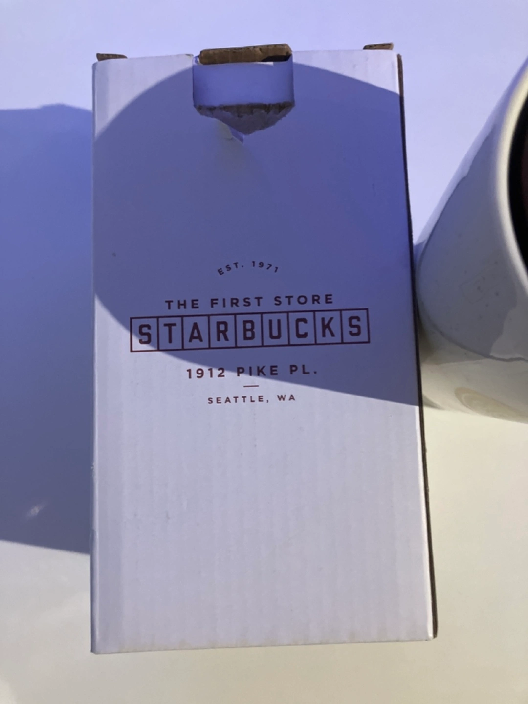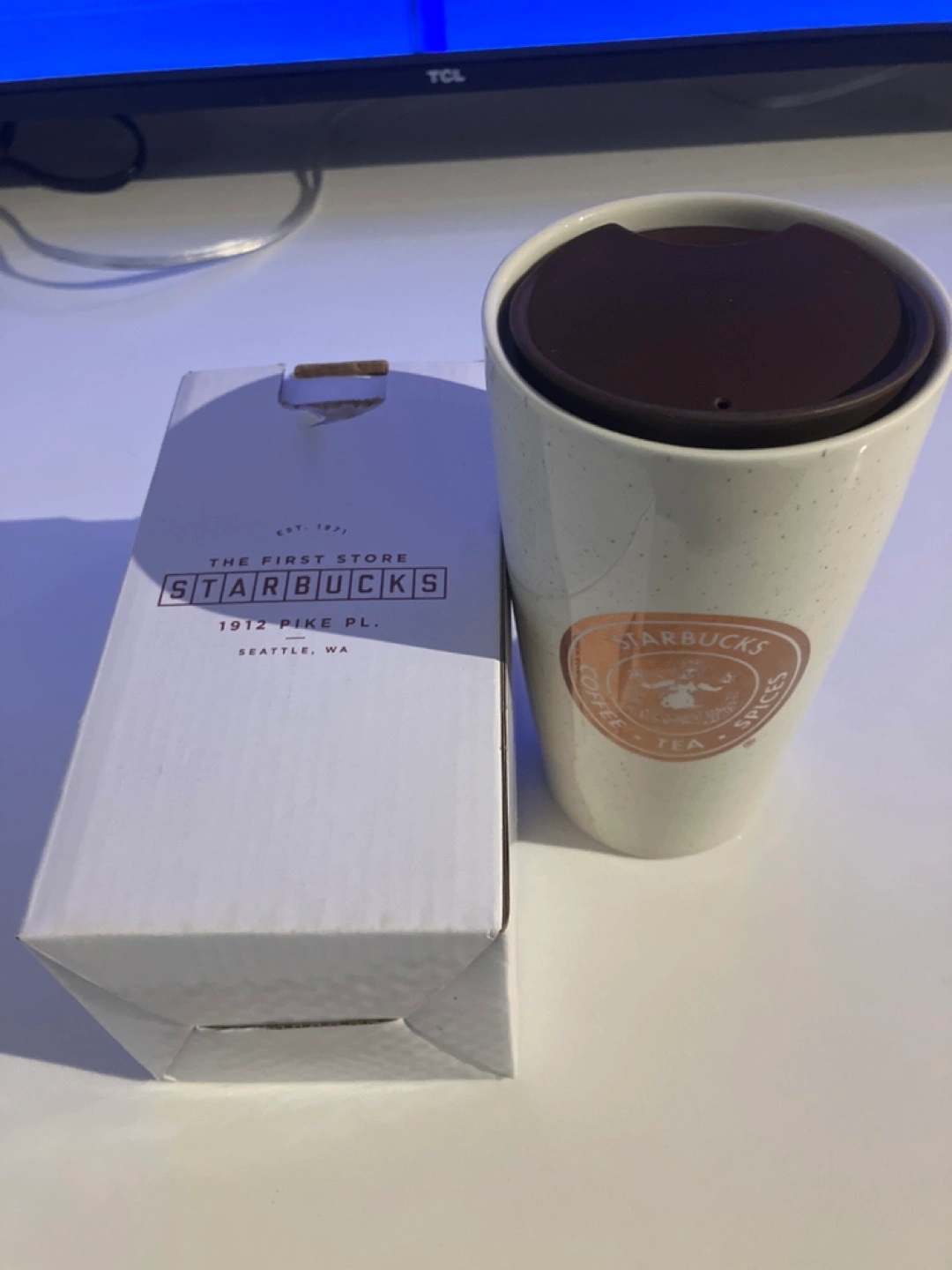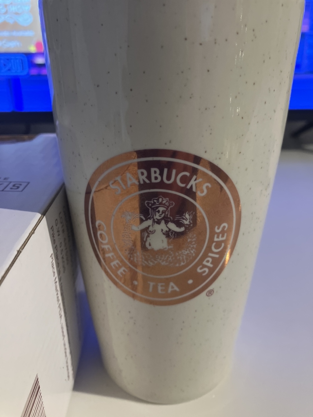 White ceramic travel mug with a brown lid. The mug features a rose gold Starbucks logo. It comes in its original box.