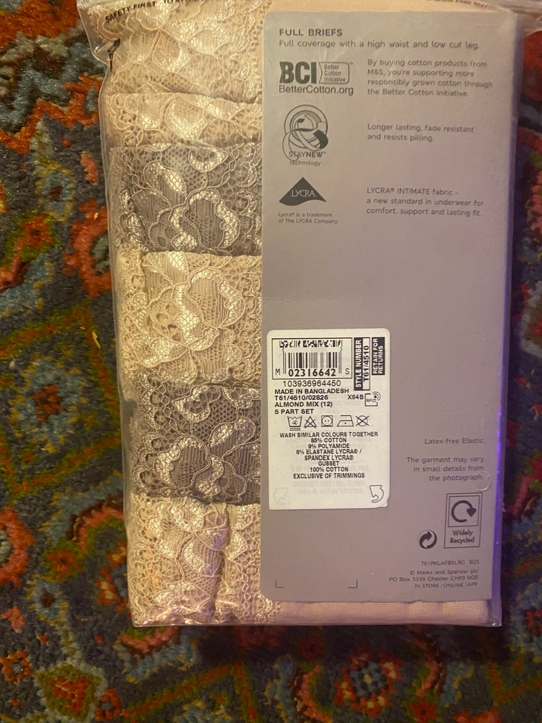 Super soft cotton rich lace briefs. 5 pack in assorted colours. Size 12 UK. Full coverage with a high waist and low cut leg. Made with Better Cotton Initiative cotton. Lycra intimate fabric.