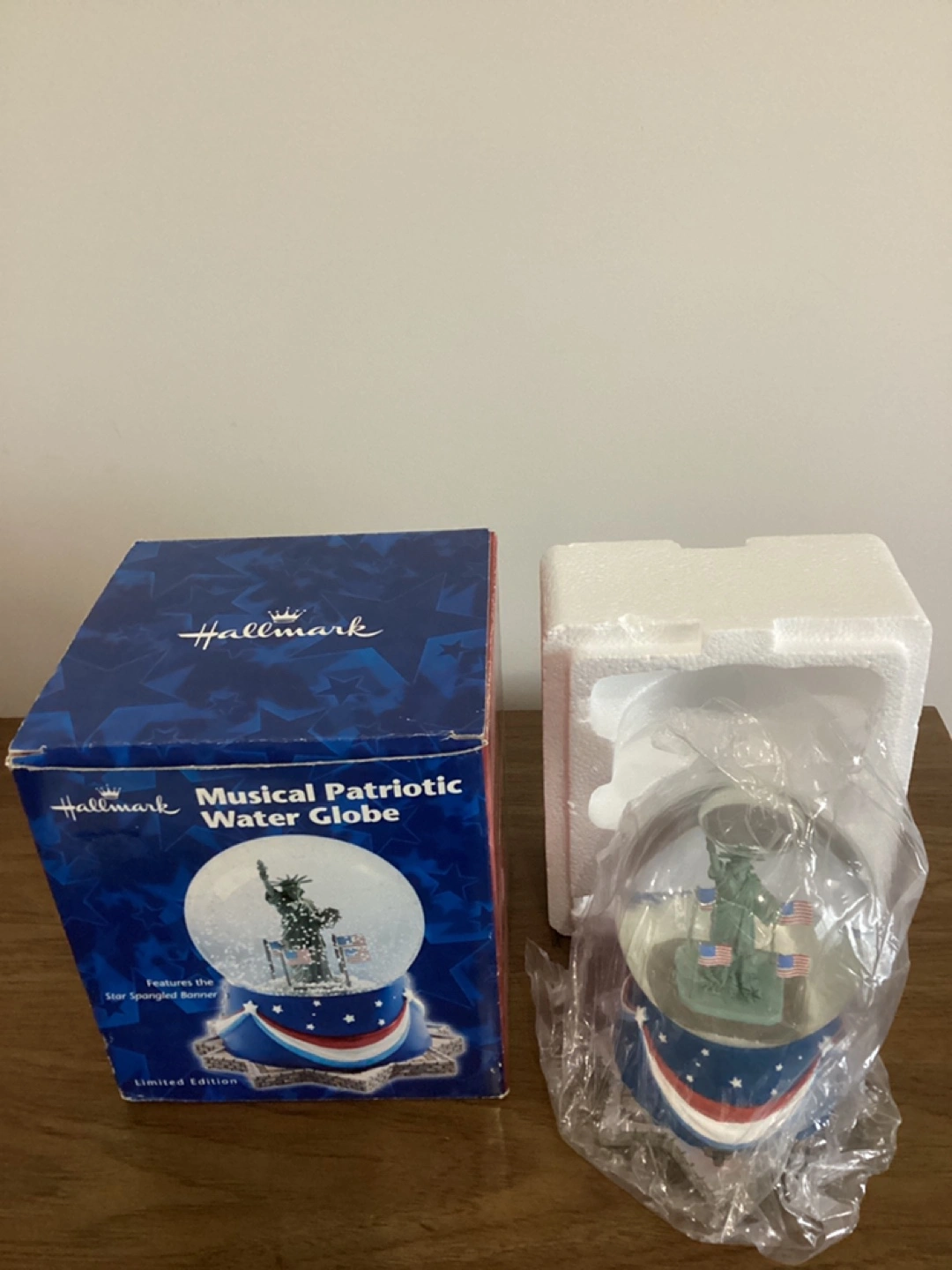 Limited Edition water globe with the Statue of Liberty and the Star-Spangled Banner. Plays music. Brand new