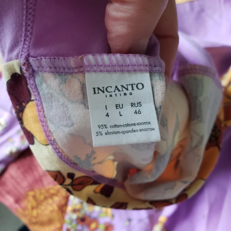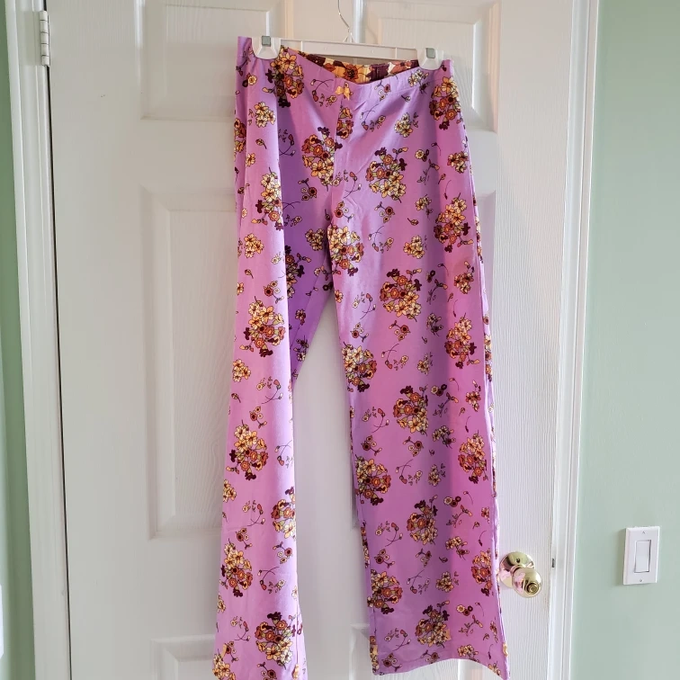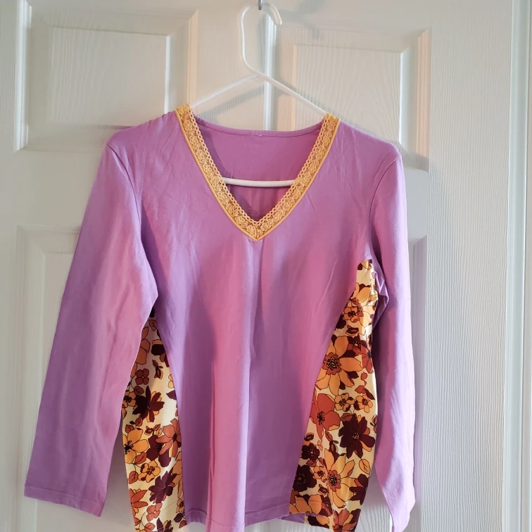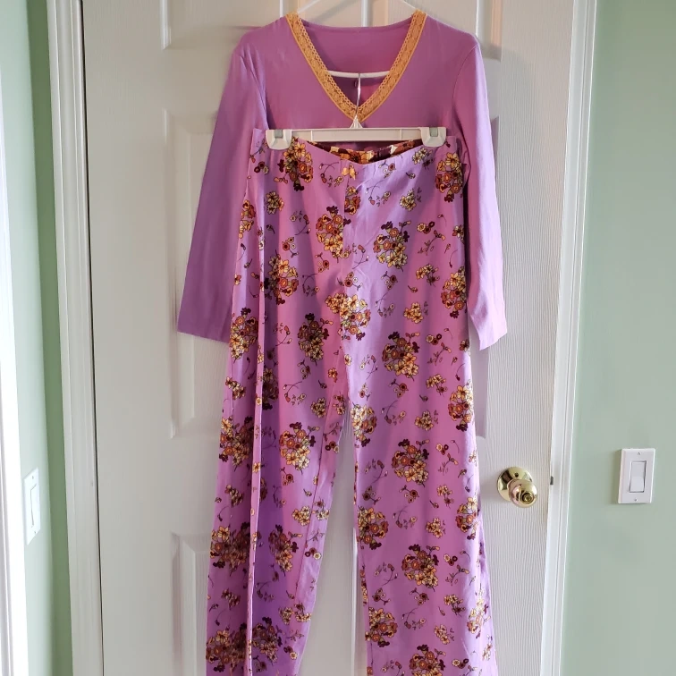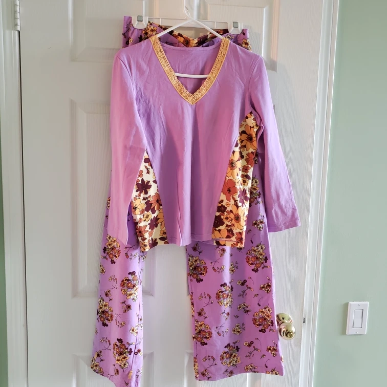 Purple long-sleeved top with floral print on the sides. Matching floral print pants. V-neck with gold lace trim. Size L.