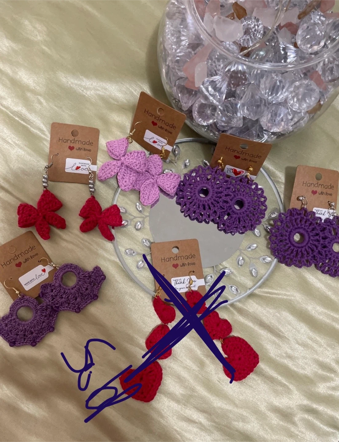 Crocheted earrings in various colours and styles. Some have beads. All have gold-coloured hooks. $5 for each