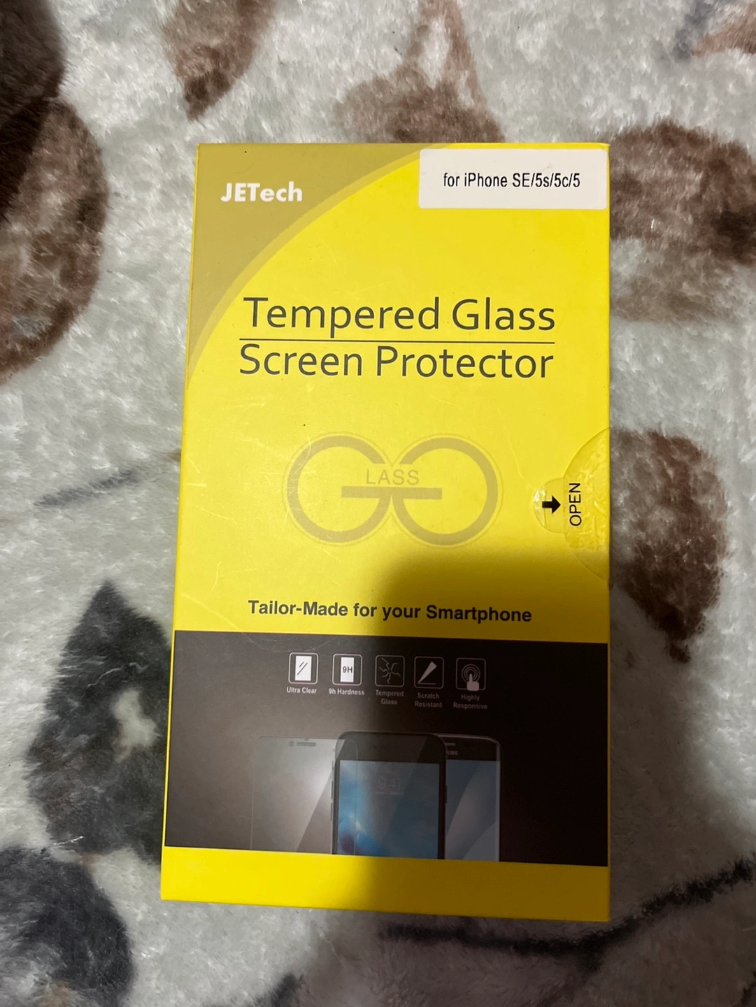 New, unopened tempered glass screen protector for iPhone SE/5s/5c. Tailor-made for your smartphone. Ultra clear, 9H hardness, scratch resistant, highly responsive.