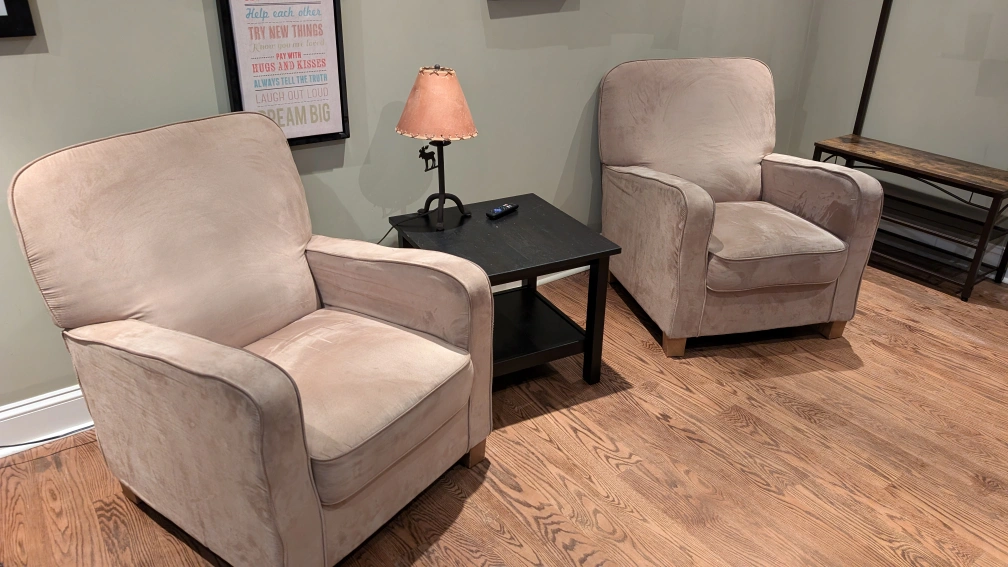 Beige upholstered armchairs. the arm on one of the chairs is a bit damaged underneath, but none of the fabric is torn. pretty comfortable chairs.