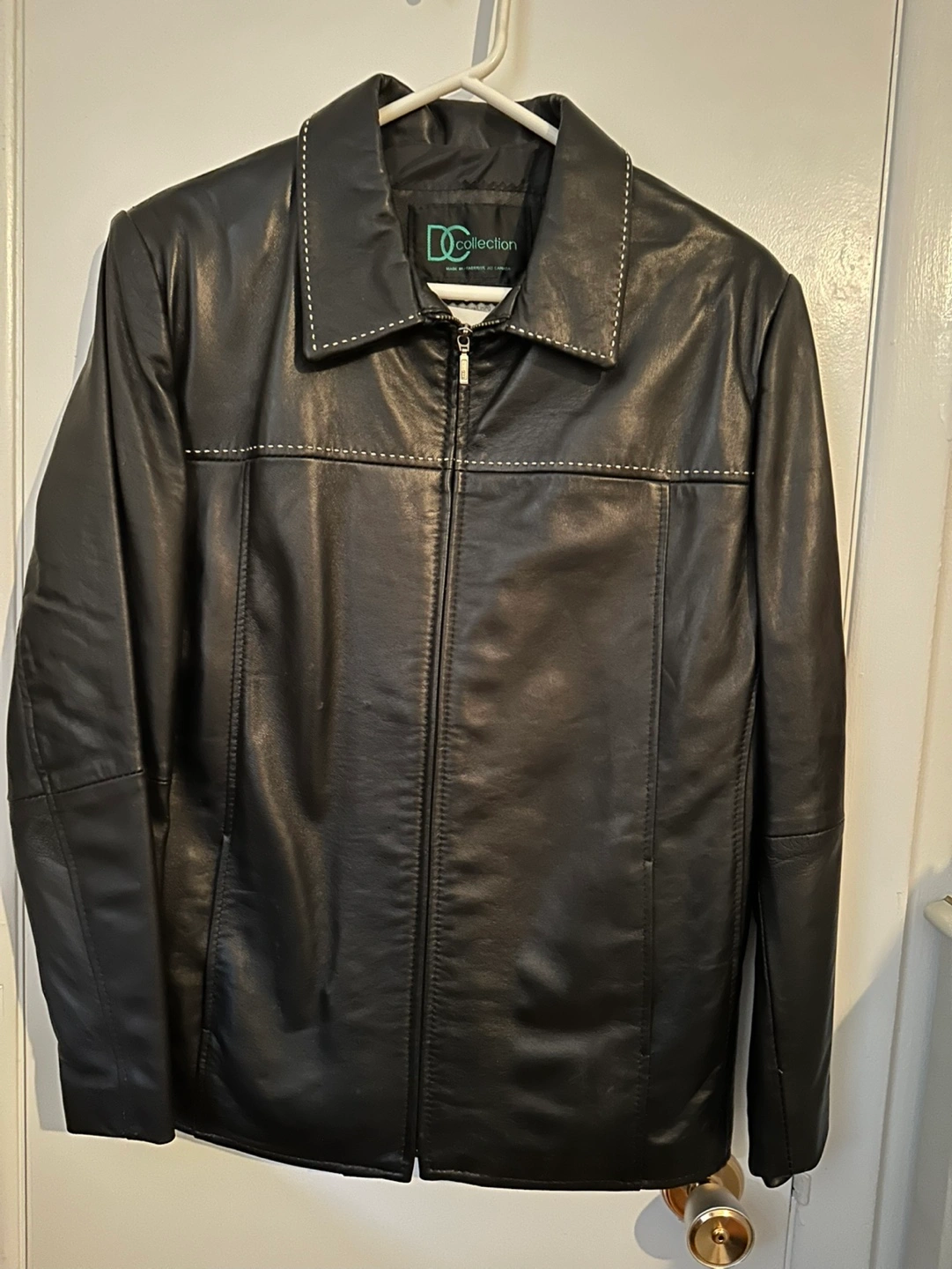 871Black leather jacket with white stitching pockets on front. Interior lining in perfect condition no holes or loose threads. Size Large. Very minor damage on front see photo 7. Made in Canada, smoke free home.