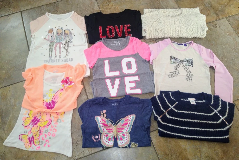 Various girl's size 7/8 shirts and sweaters in new condition from a smoke and pet free home.