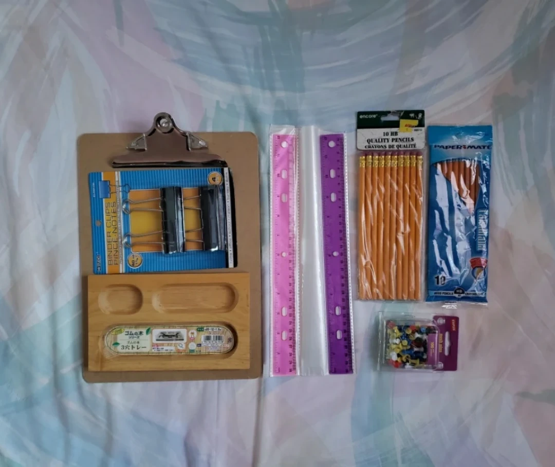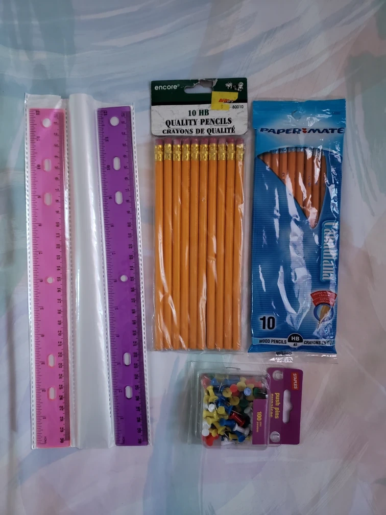 Bundle includes: 4 large binder clips, clip board, wood organizer, 2 rulers, 20 pencils and 100 push pins Except for the rulers, everything else is sealed and unused Selling bundle as a whole, not selling separately Hoping the items find a new home! From a smoke-free & pet-free home Cash only & exact change All sales are final; no refunds or reservations Pick-up only Location: Richmond Hill Serious inquries only; messaging only through Karrot Thank you for your interest & please check my 200+ listings for more!