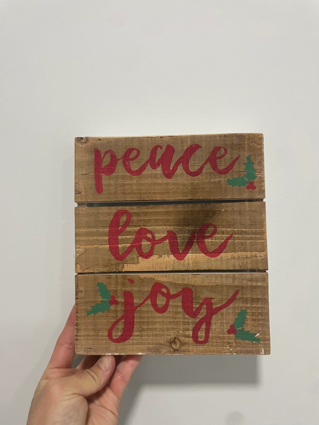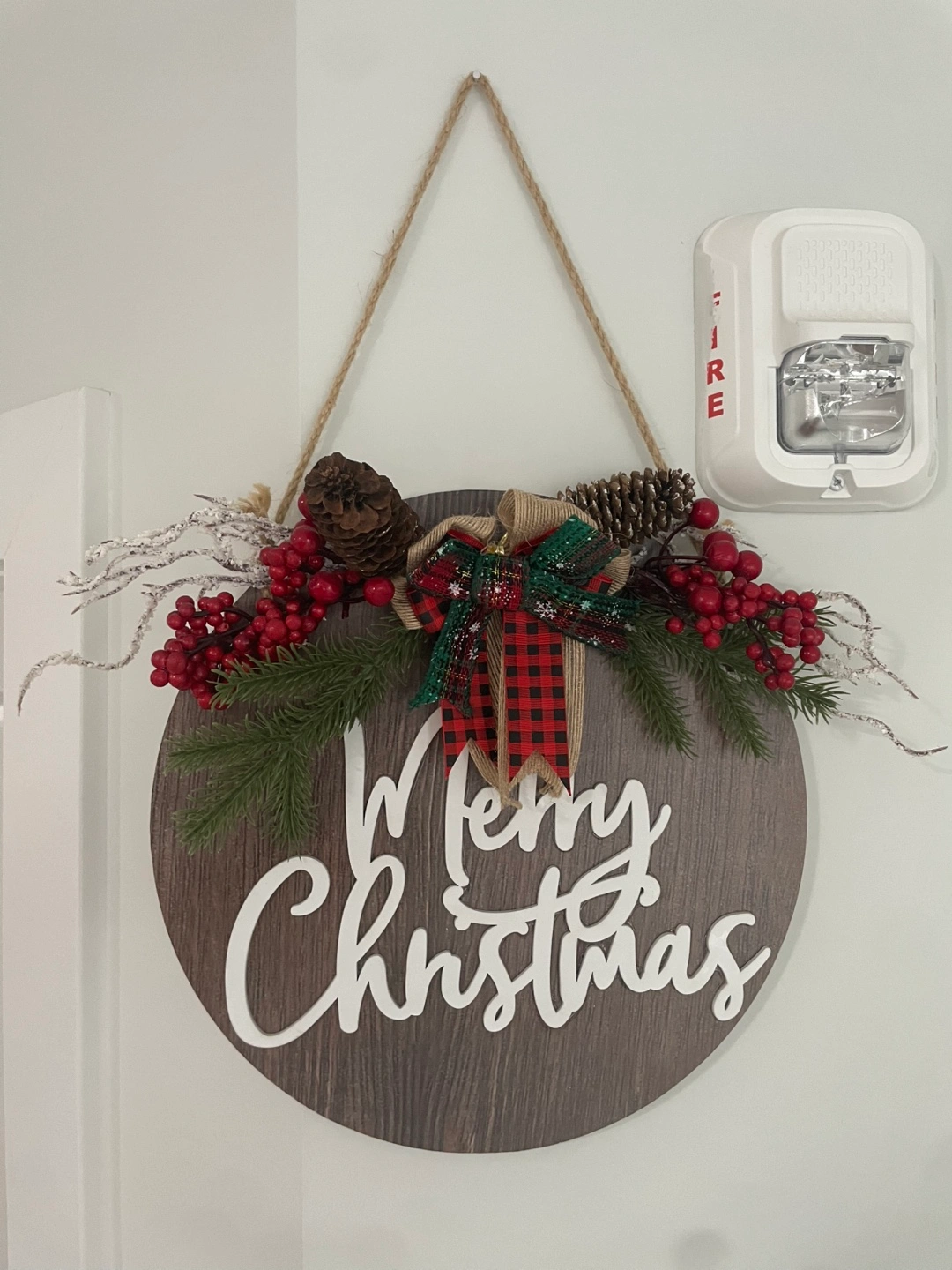 Round wooden sign with the words Merry Christmas in white lettering. Decorated with a red and black plaid bow, pine sprigs and red berries. Great for the upcoming Holidays to light up your house!