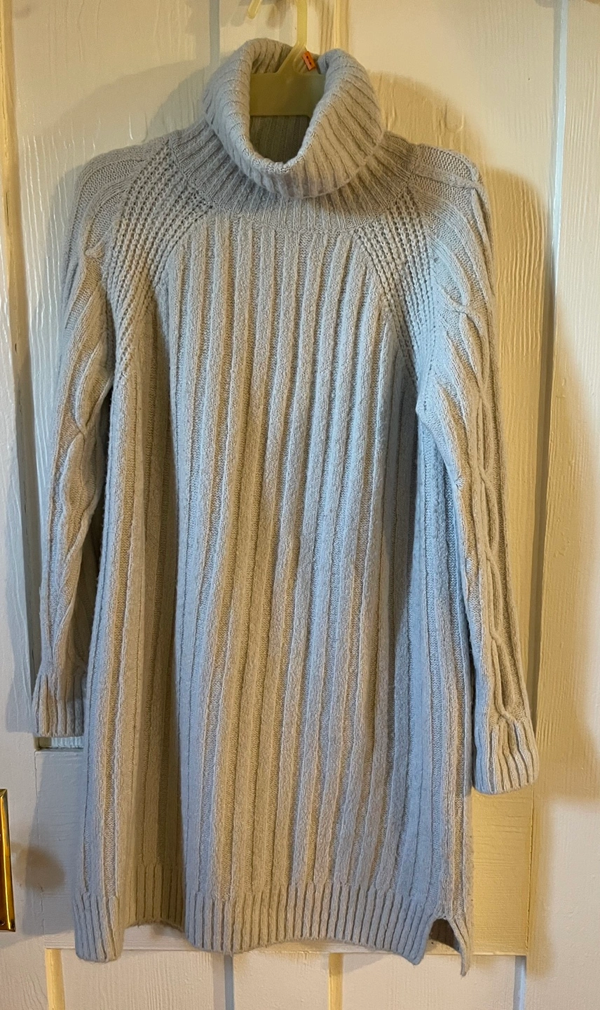Long sleeve, light grey turtleneck sweater dress. Cable knit detailing on the shoulders and sleeves. Ribbed knit. Loose fitting for size 4/small. Can fit medium. Warm and comfy. Material is polyester.