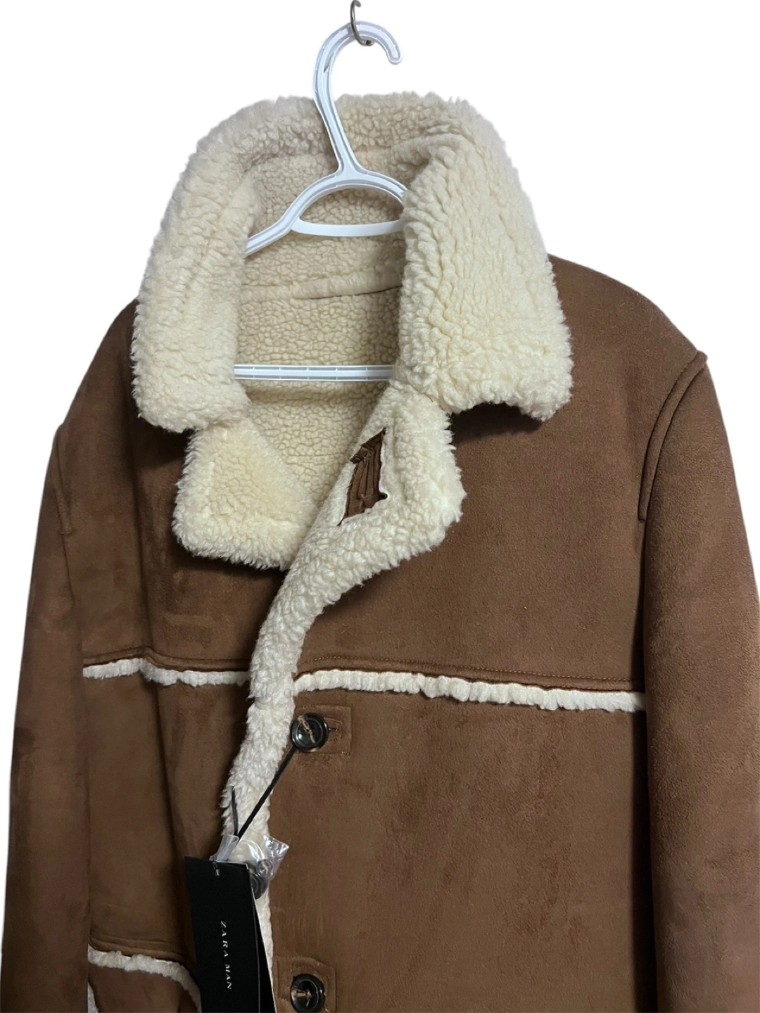 Brown shearling jacket with a white fleece lining. Features two front pockets, a button closure, and a white trim. ( Never been used, still with Tag)