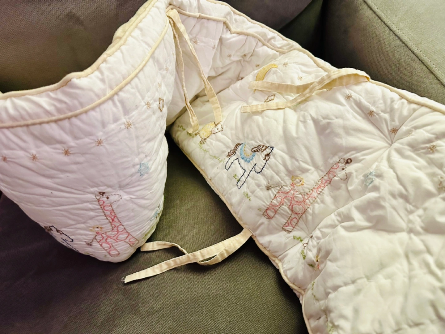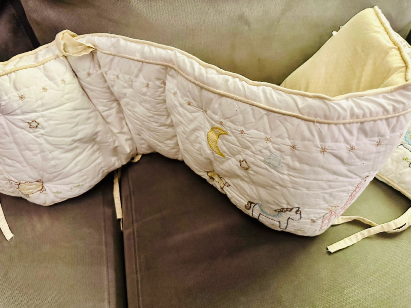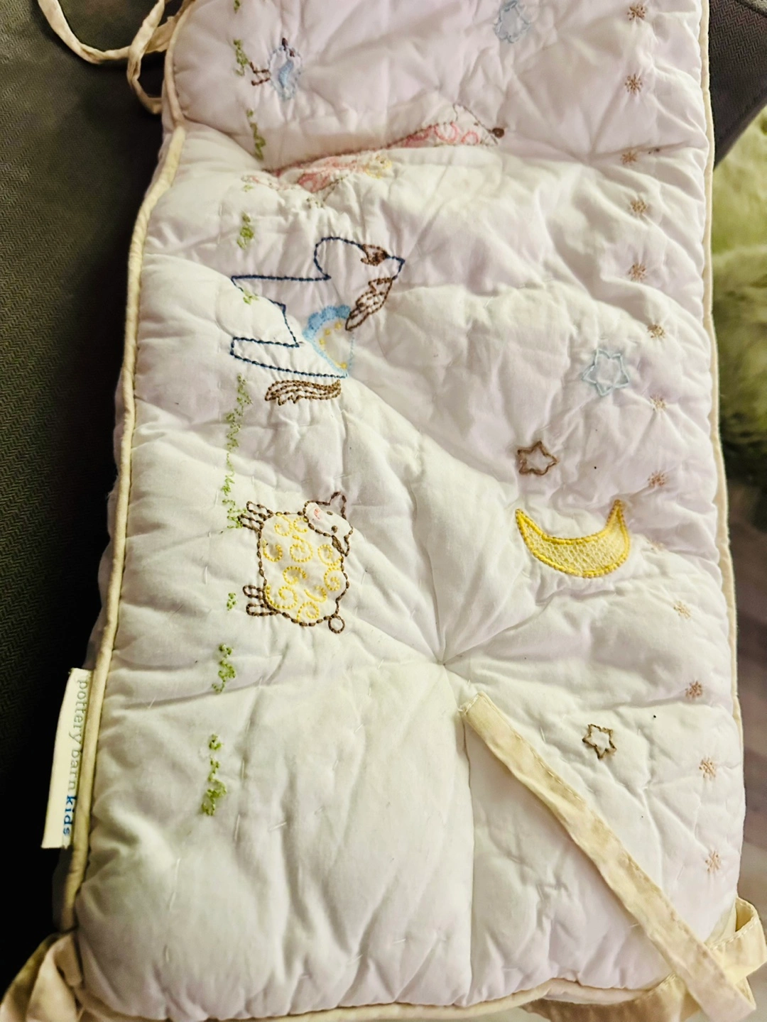 EUC Pottery Barn crib bumper with embroidered animals and stars, cream coloured with tan ties. High quality and very soft yet durable.
