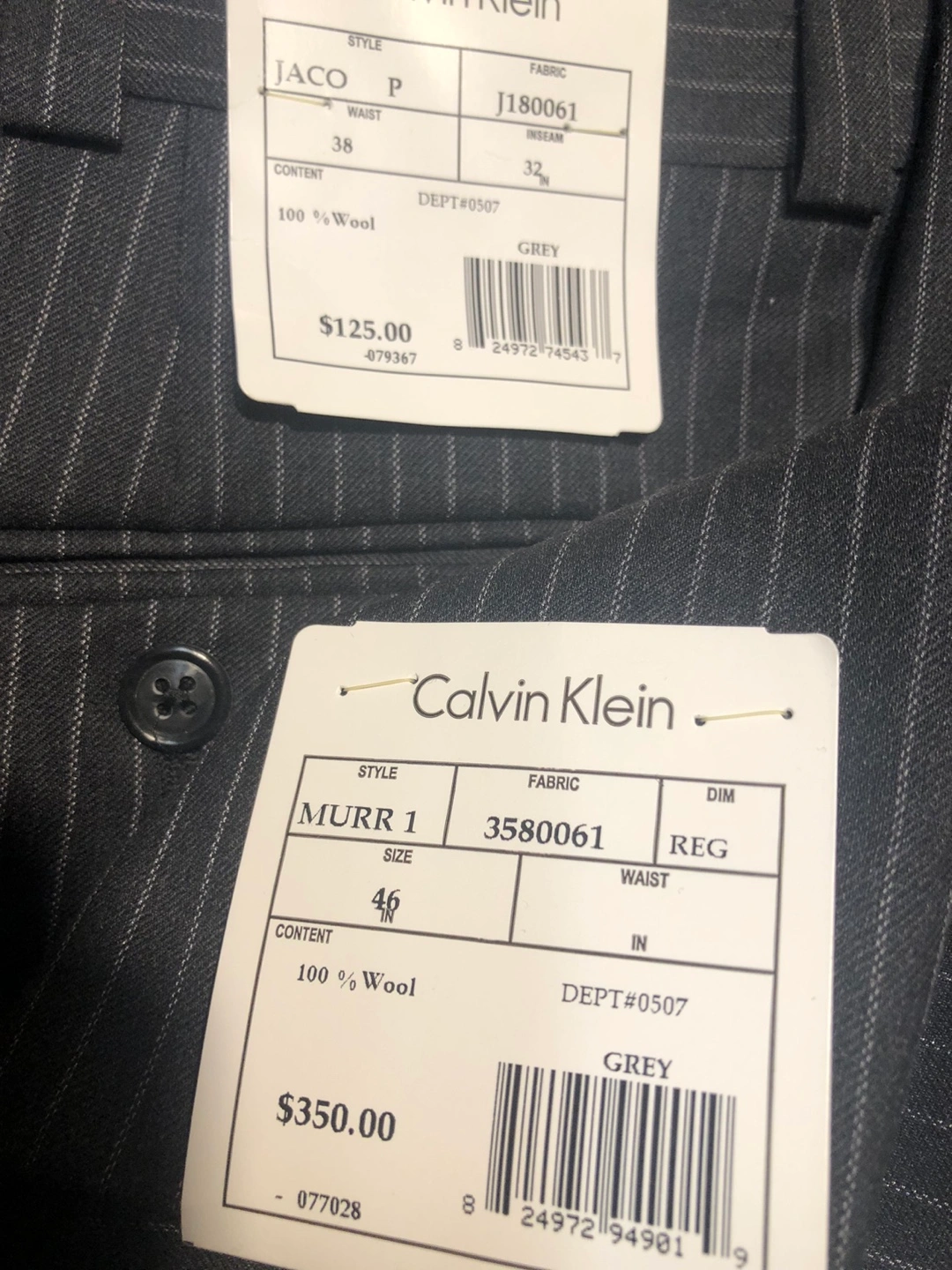 New Gray pinstripe suit jacket 100% Wool , Three button closure. Two flap pockets and one chest pocket.also the Matching Pants , Absolutely Beautiful, Jacket is 46 , Style Murr1 , Pants are 38 W X 32 long