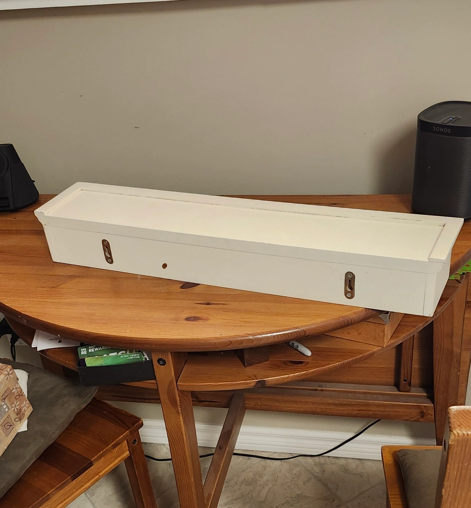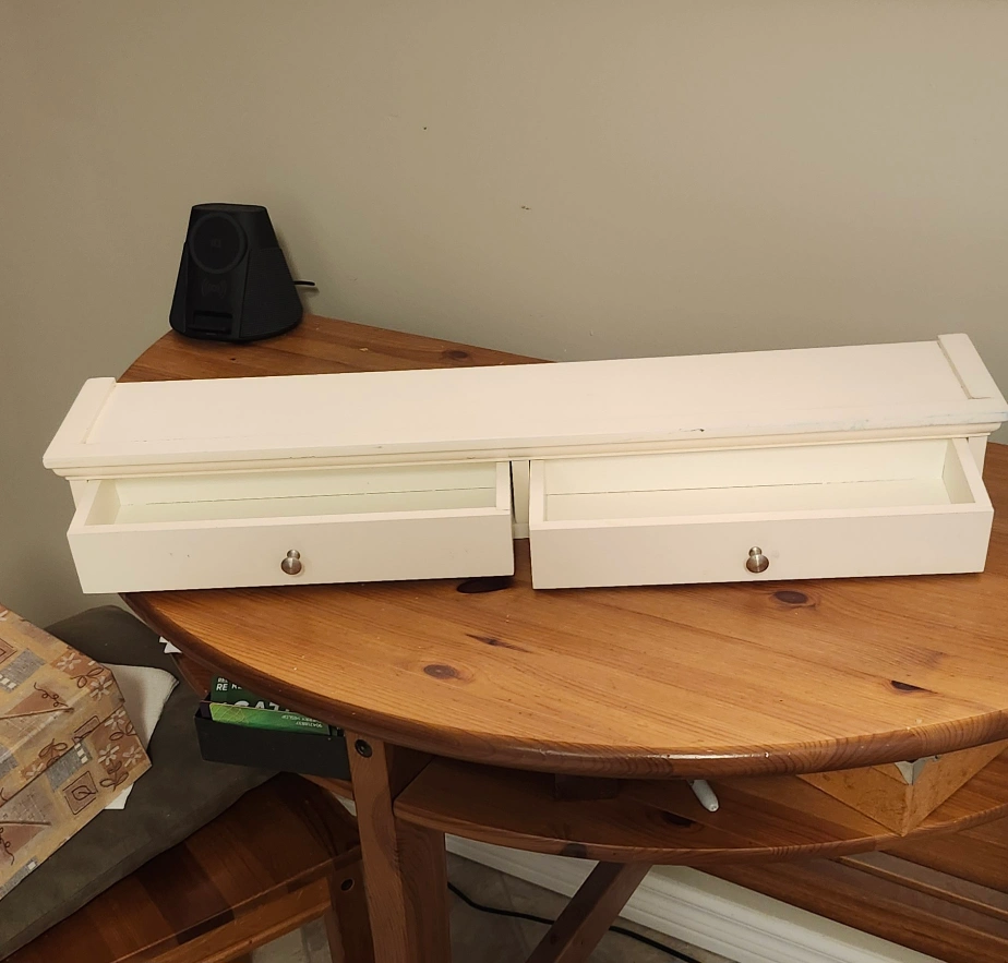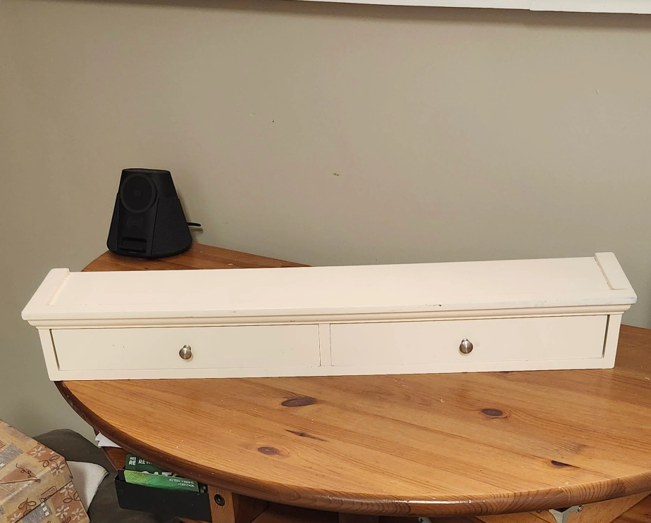 Wooden shelf with two drawers. Great for organizing and displaying items. The shelf is in good condition, but there are some minor scratches on the paint. can be used as a floating shelf as well. Non-smoking no-pet home.