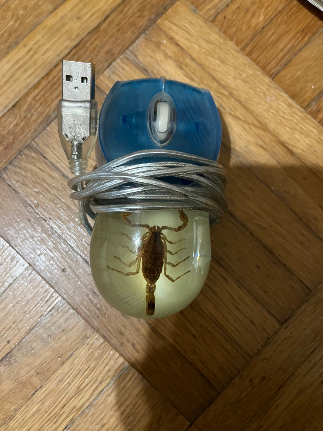 Wired optical mouse with a scorpion encased in resin. The mouse is blue and silver. The cord is coiled. I honestly do not know if this still works or not it’s pretty old someone gave it to me I’ve never used it myself tho. It’s pretty cool
