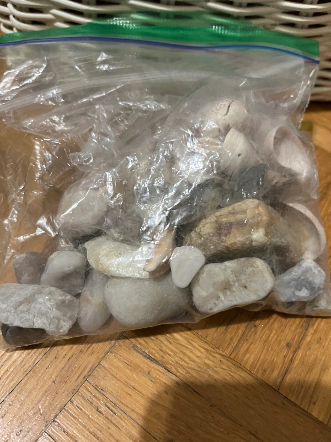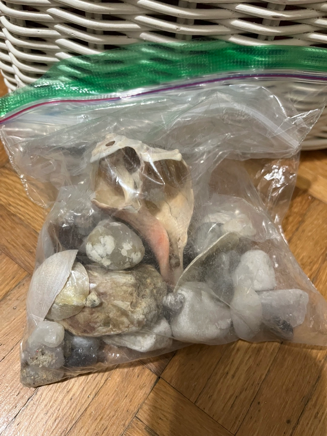 Bag of seashells and stones. Perfect for crafts, decoration, or a beach-themed collection. I got these Boston cape cod there’s a small variety of shells stones sea glass possibly can’t remember but just a few cool things. They look better in water rn they just dry they are pretty