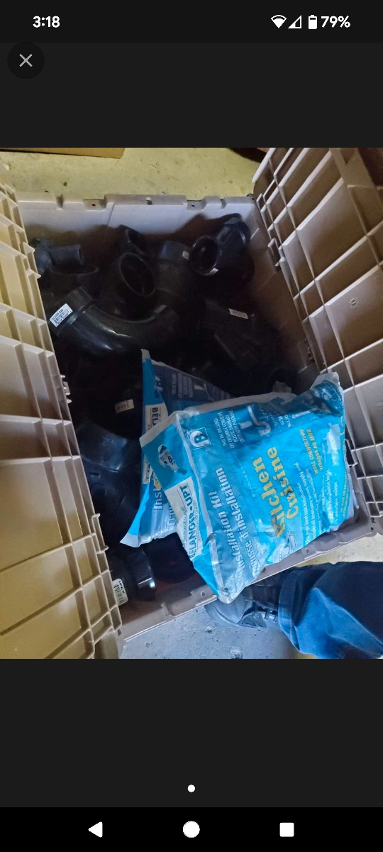 Assortment of black plumbing fittings in a plastic tote, includes a new Belanger-UPT kitchen installation kit. big bucket of plumbing supplies. all different sizes. save with bulk. trying to sell as a lot to clear space in garage. pick up in markham